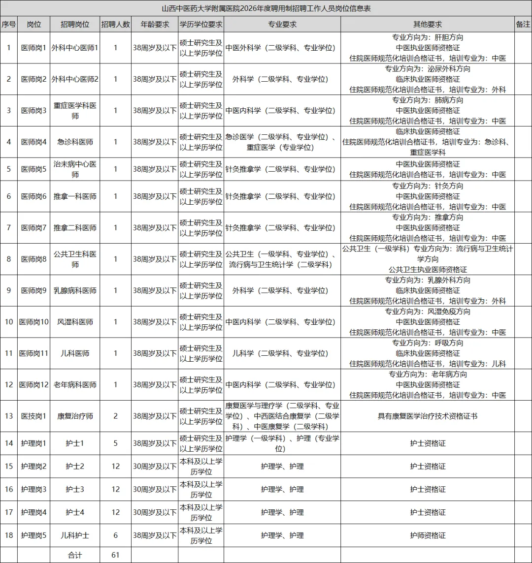 💡 中国中医科学院西苑医院山西医院(山西中医药大学附属医院)招聘61人