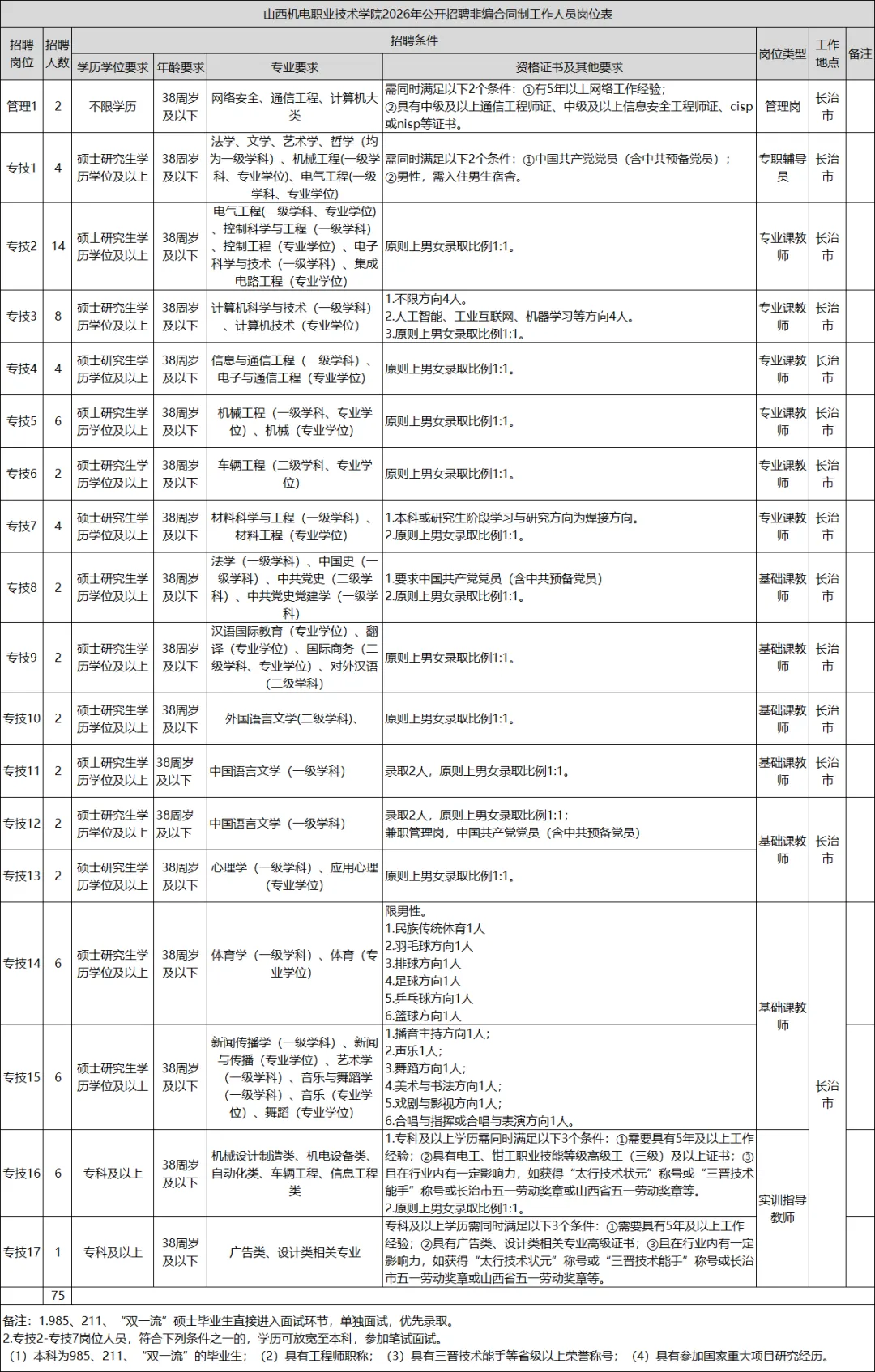 💡 山西机电职业技术学院招聘75人