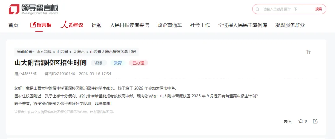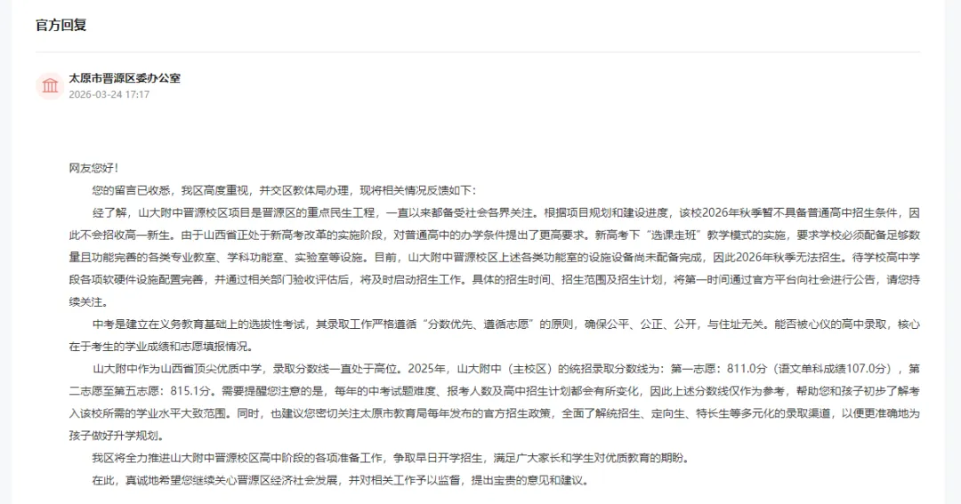 经了解,山大附中晋源校区项目是晋源区的重点民生工程,一直以来都备受社会各界关注。根据项目规划和建设进度,该校2026年秋季暂不具备普通高中招生条件,因此不会招收高一新生。由于山西省正处于新高考改革的实施阶段,对普通高中的办学条件提出了更高要求。新高考下“选课走班”教学模式的实施,要求学校必须配备足够数量且功能完善的各类专业教室、学科功能室、实验室等设施。目前,山大附中晋源校区上述各类功能室的设施设备尚未配备完成,因此2026年秋季无法招生。待学校高中学段各项软硬件设施配置完善,并通过相关部门验收评估后,将及时启动招生工作。具体的招生时间、招生范围及招生计划,将第一时间通过官方平台向社会进行公告,请您持续关注。