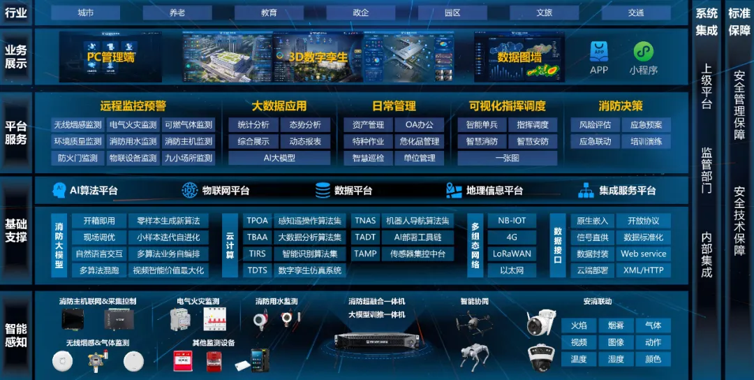 通过系统部署无线烟感、可燃气体监测、电气火灾监控、消防用水监测、视频AI识别等子系统,可以在建筑内部关键节点织就一张立体化、无盲区的物联感知网络,实时采集消防设施状态与环境风险数据,为建筑建立精准、动态的“数字镜像”,实现隐患的可知可视。所有感知数据实时汇聚至云端智能中枢,平台通过深度挖掘与数据分析,精准识别异常情况、甄别真实火警,并将原始数据转化为可行动的预警通知。而且平台面向消防维保、应急演练、协同调度与指挥决策等核心业务场景,提供消防远程监管的全流程业务需求,助力用户打通从“风险预警”到“处置反馈”的全流程闭环,赋能消防安全管理实现从被动响应到主动预防的转变。