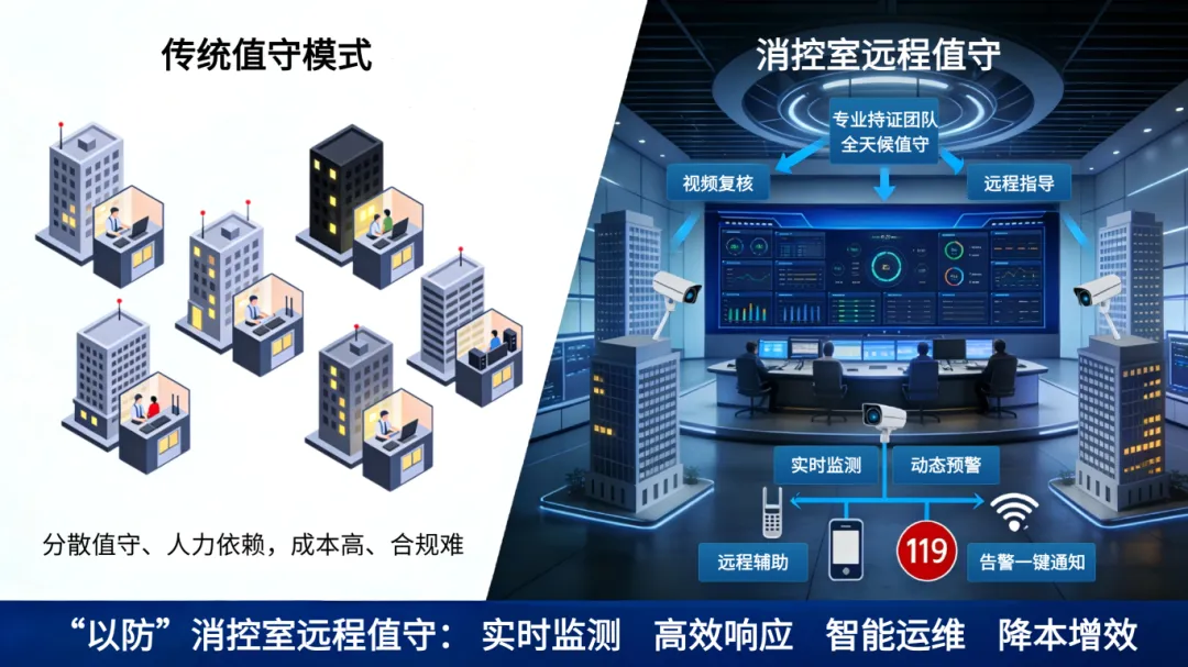 针对消控室值守困境,特致珈推出“以防“消控室远程值守,通过消防主机联网实现火灾报警信息的实时采集,并通过物联网终端采集设备,对风机、水泵、门禁、梯控设施进行全面监测与调控。所有数据实时接入“以防”远程值守中心,由专业持证人员实行7×24小时统一监控、复核与远程辅助。一旦发生报警,值守专员立即通过视频监控进行可视化复核,并辅助远程指导现场人员进行初步处置,大幅降低误报与漏报风险。确认真实火情后,中心可一键启动应急预案,联动现场巡逻力量、物业负责人乃至消防救援部门,实现分级协同、高效处置。该模式不仅有效缓解了项目单位专职人员配备的压力,降低长期运营成本,更通过标准化、专业化的流程,显著提升了火情响应的准确性与处置专业性,让消防安全值守迈向集约化、智能化新阶段。