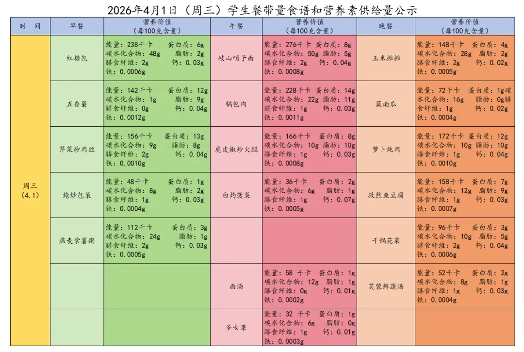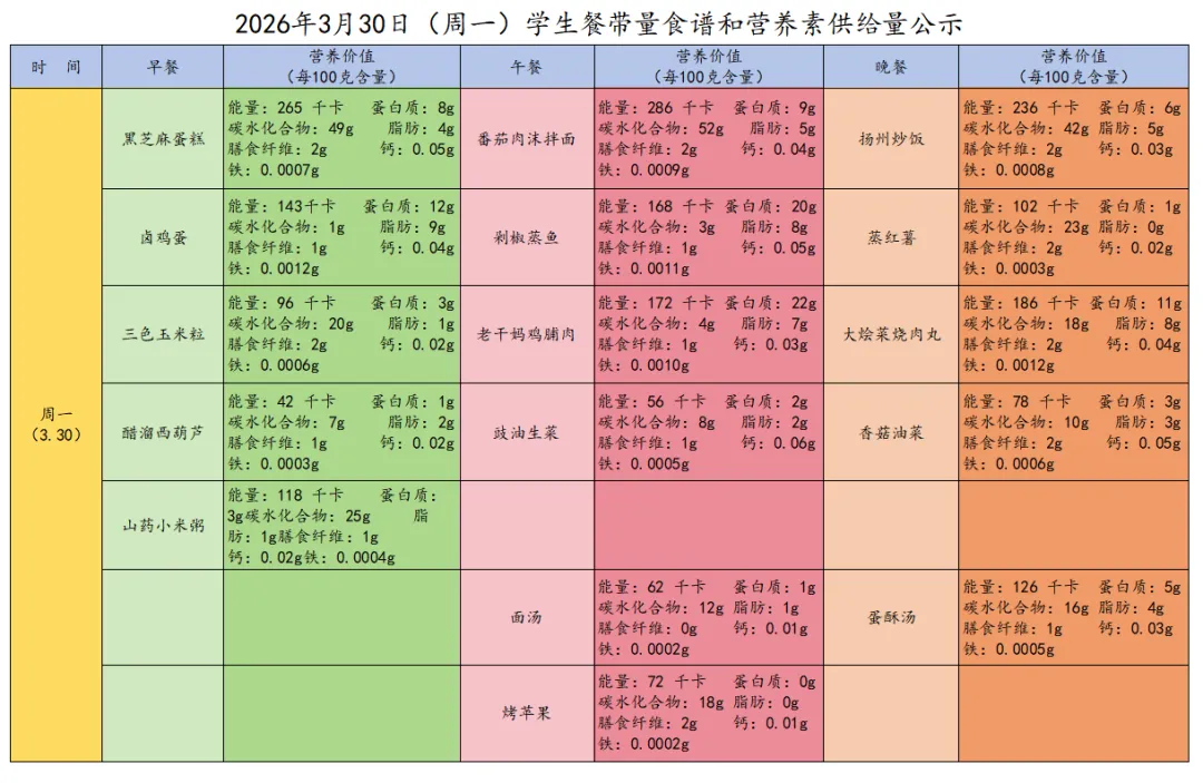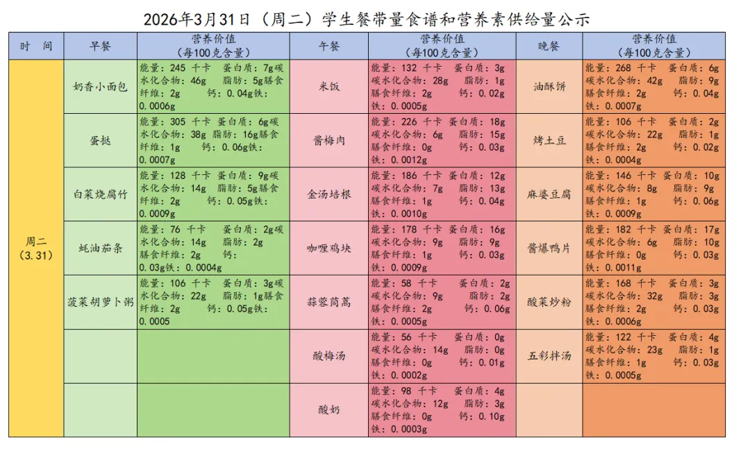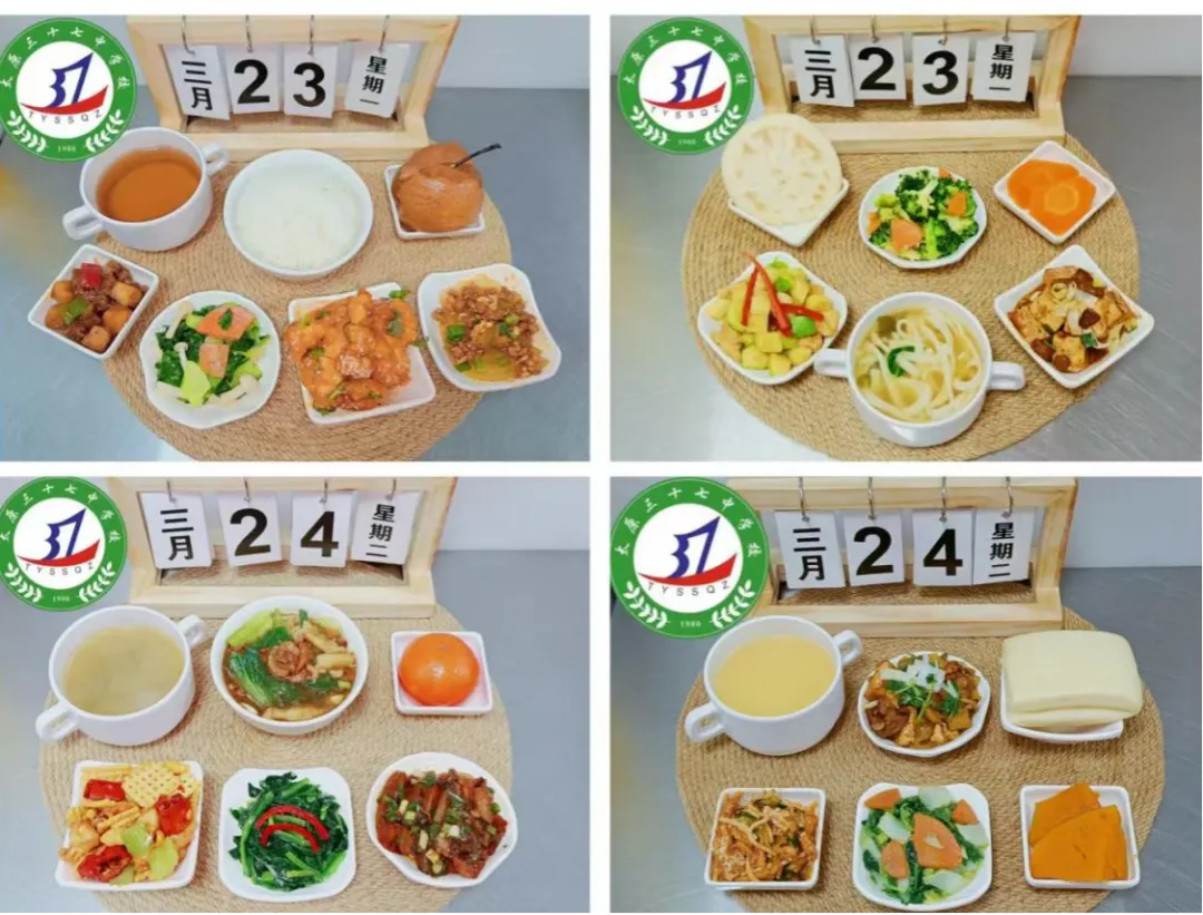 感谢您对太原市第三十七中学校的支持与关注。为了让您全面了解三十七中学子在学校的饮食情况,根据《太原市中小学校园食品安全和膳食经费管理监督办法》相关规定,学校每周餐带量食谱和营养素供给量确保学生膳食安全、营养、均衡、满足孩子健康成长需要,为我校学生做出安全健康可口的饭菜。给孩子一个健康、美味的成长时光,是您的期待,也是我们的责任!现将本周(3月30日—4月3日)的学生菜谱进行公示,欢迎各位师生及家长监督!