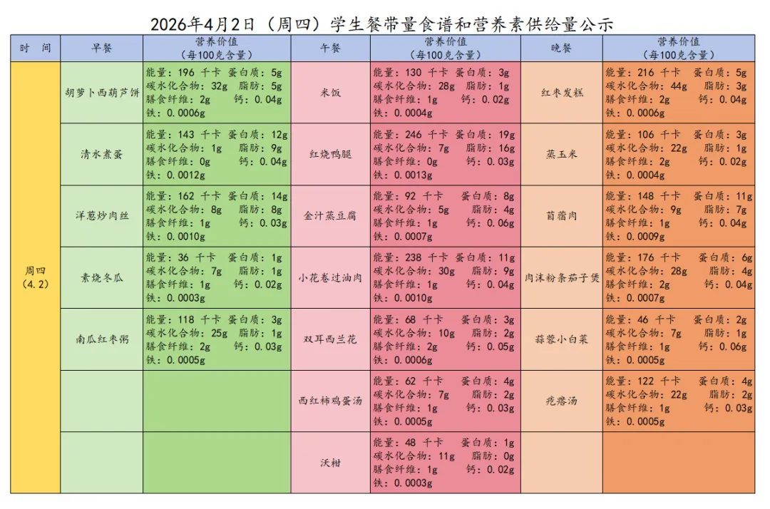 说明:上述为学生食谱营养餐量搭配情况。