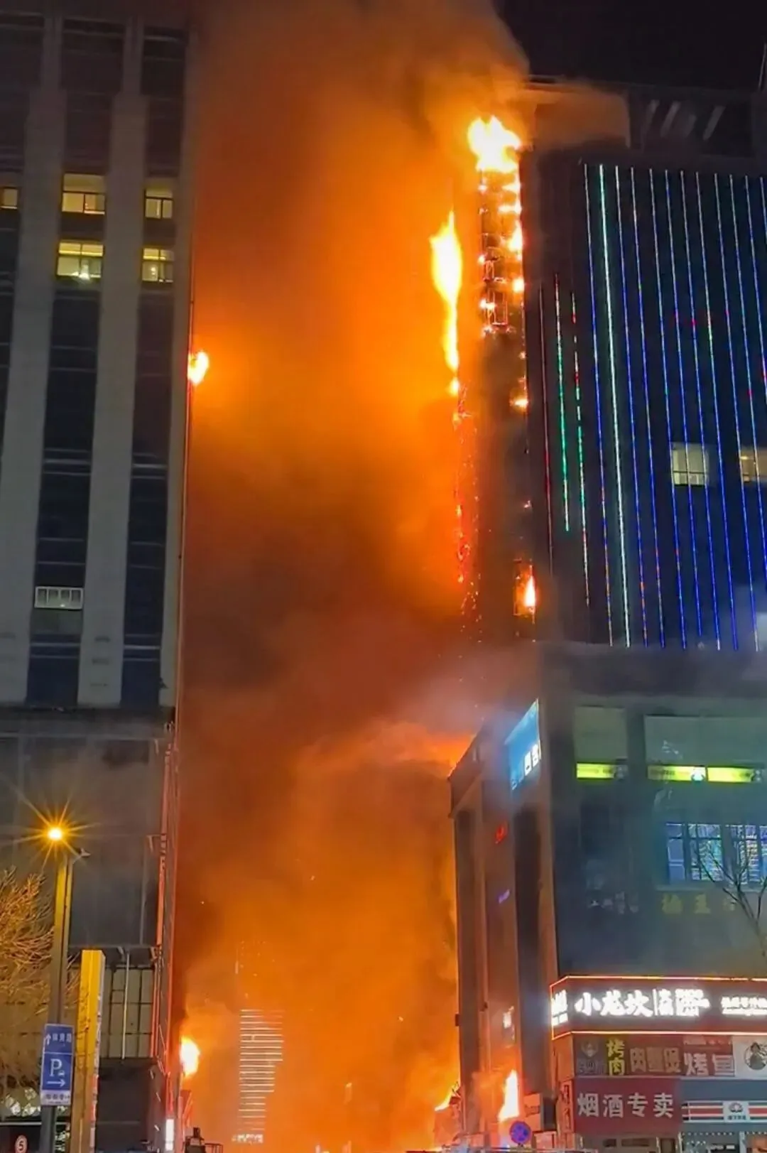 起火饭店楼下道路一侧尽头为一小区(记者实拍)有目击者拍摄的视频显示,最开始,大楼底部有一家烧烤店上方起火,喷出火舌。多位目击者称,火情最初是出现在大楼东面底商一家名为“大龙烧烤炒菜”的店铺顶部,随后大火蔓延,引燃了大楼东侧外立面保温层。