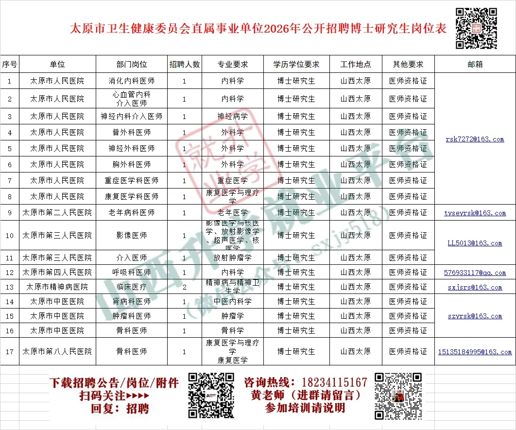 太原市卫生健康委员会直属事业单位2026年公开招聘博士研究生公告