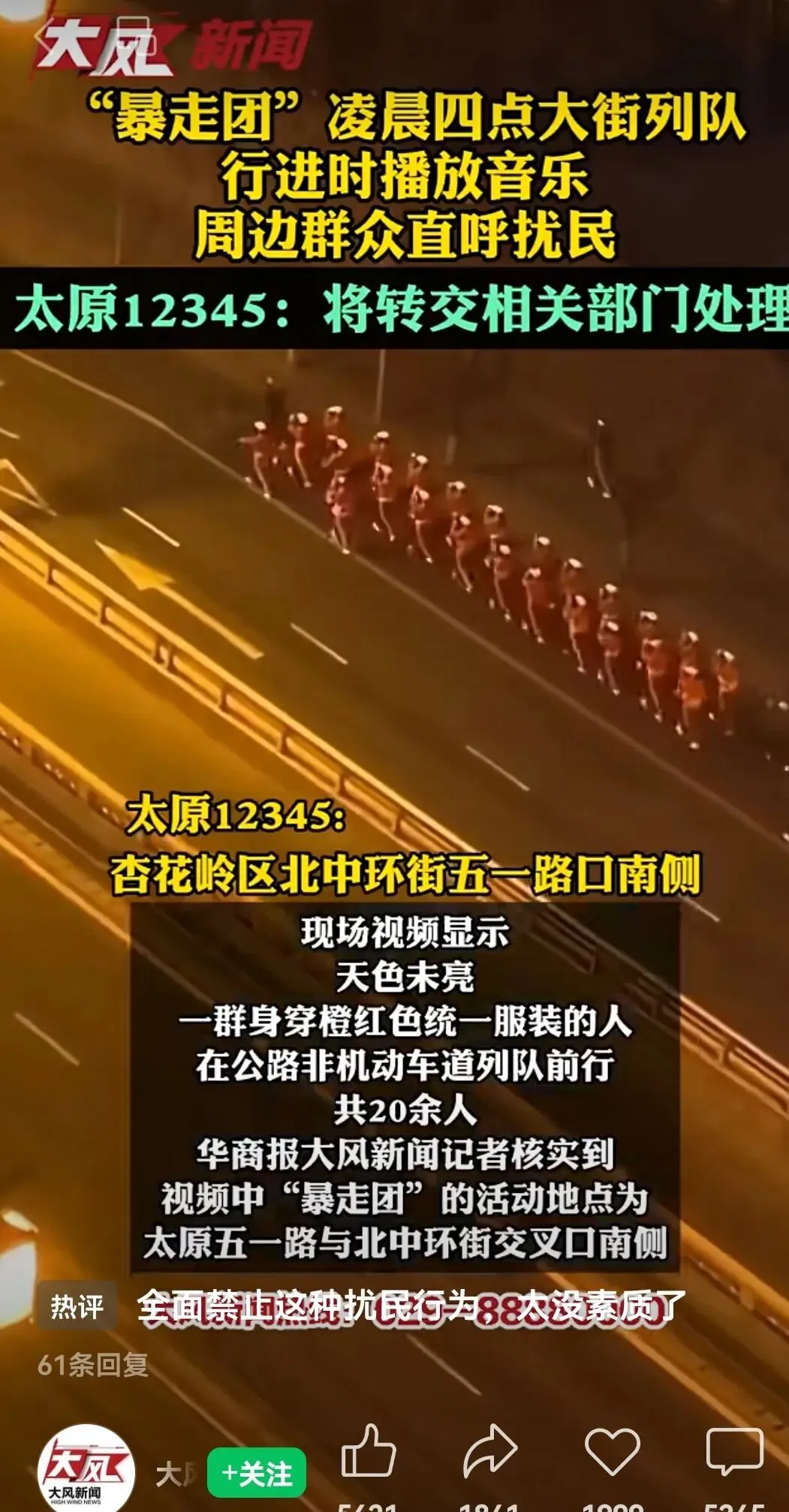 现场视频显示,天色未亮,一群身穿橙红色统一服装的人在公路非机动车道列队前行,共20余人。记者核实到,视频中“暴走团”的活动地点为太原市杏花岭区五一路与北中环街交叉口南侧。