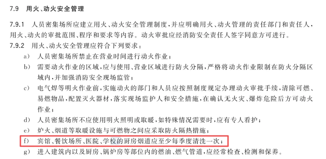 3月28日晚太原市小店区亲贤北街附近一建筑发生火灾,此次火灾造成3人死亡(其中2人送医后抢救无效身亡),另有23人受伤,其中9人伤势较重。根据目击者拍摄的视频显示,火灾最初是由楼下烧烤店喷出火舌,火焰沿建筑外墙向上迅速蹿升,并伴随有大量浓烟。火灾发生后,火势蔓延极快,迅速蹿升至楼顶,外墙墙板随燃烧掉落至街道上。2025年12月,安徽省安庆市一沿街餐饮门店后厨突发火灾。消防员到达现场后发现,起火部位是厨房油烟管道,火势已从一楼沿管道蔓延至顶楼。经过紧张扑救,明火被成功扑灭。据悉,事发时,后厨工作人员正在熬油,产生的火星不慎迸入油烟管道,并将管道里的油污引燃。所幸扑救及时,未发生人员伤亡。2022年3月,云南省昆明市一中学食堂发生火灾,所幸消防员及时赶到,妥善处置了现场,无人员伤亡。事后查明:系油烟管道积油垢过多,做菜时火星引燃油垢引发火灾。2020年5月27日,上海市徐汇区一餐厅厨房发生火灾。经调查,该起火灾的起火原因为员工操作不当导致蒸箱故障引发火灾,高温引燃了油烟管道内附着的大量油污,导致餐厅通往顶层平台的油烟管道全面燃烧,产生了大量烟气。事故未造成人员伤亡。餐厅厨房的油烟管道在长期使用后,表面会沉积一层油脂。这些油垢看似只是卫生问题,实则潜藏着巨大的火灾隐患。油垢的形成源于日常烹饪。中餐制作常用的煎、炒、烹、炸等方法会产生大量油烟,这些油烟在排除时遇冷凝结,黏附在排烟机表面和油烟管道内壁,短时间内就能形成一层油垢。尤其是油烟管道转角处最容易堆积油垢,这些角落不易被察觉,却最危险。油垢本身是可燃的,遇明火或高温会燃烧。当厨房灶火被抽风机吸入油烟管道,或者炒菜时颠锅蹿起的火苗,都极易引燃这些积存的油垢。一旦着火,火焰会迅速蔓延,因为烟道并非独立存在,大多会连通主烟道,可能导致整条主烟道全面起火。针对油烟管道的火灾隐患,各地消防部门制定了相关规定。国家标准GB/T 40248-2021《人员密集场所消防安全管理》明确要求,宾馆、餐饮场所、医院、学校的厨房烟道应至少每季度清洗一次。具体而言,排油烟管道清理每90天应当不少于1次,抽油烟机、集烟罩、烟道入口处1米范围内应当每天清洗。北京市要求中餐操作间的排油烟管道应当每60日至少清理1次,重庆市则规定对未定期检查、清洗和保养的餐饮场所处5000元以上10000元以下罚款。贵州黔南一位老人在家中厨房炒菜时,在颠锅的瞬间,抽油烟机将火苗吸入,火苗顺着油垢瞬间将排烟管道引燃,所幸扑救及时,未造成更大损失。抽油烟机油污长期积累后,遇明火(如炒菜时的火苗、电器火花)极易燃烧,且油烟管道相对封闭,火势会迅速蔓延,应及时清理抽油烟机内及叶片积累的油污,定期更换抽油烟机排烟管道。为从源头防范后厨火灾,餐饮场所必须落实全面、细致的防火措施:- 及时清理油烟管道:抽油烟罩每日用完后要擦洗一次,清除当日油垢;每个季度要对油烟机、油烟管道彻底清洗一次。对于油烟排放量大的餐饮场所,建议每60天彻底清理一次积聚的油脂。
