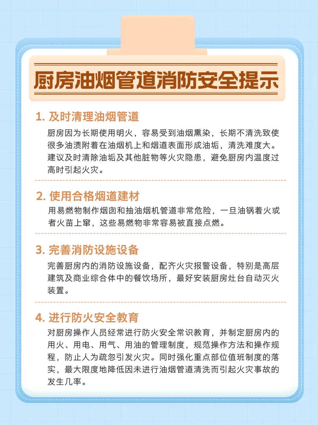 - 使用合格烟道建材:一定要使用合格的烟道建材,避免使用易燃物制作烟囱和抽油烟机管道。