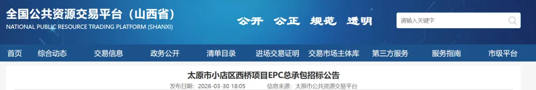 3月30日,山西省公共资源交易中心消息,太原市小店区西桥项目EPC总承包开始招标。项目总投资约49458万元。