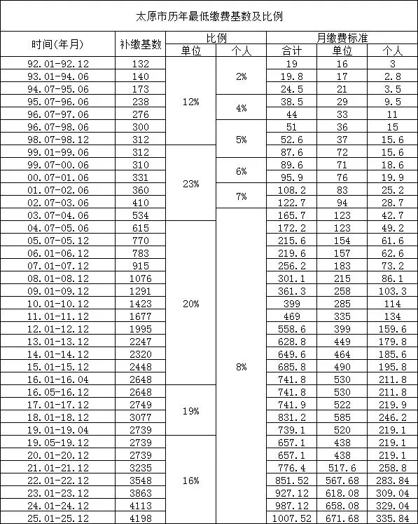 >太原市历年最低缴费基数及比例