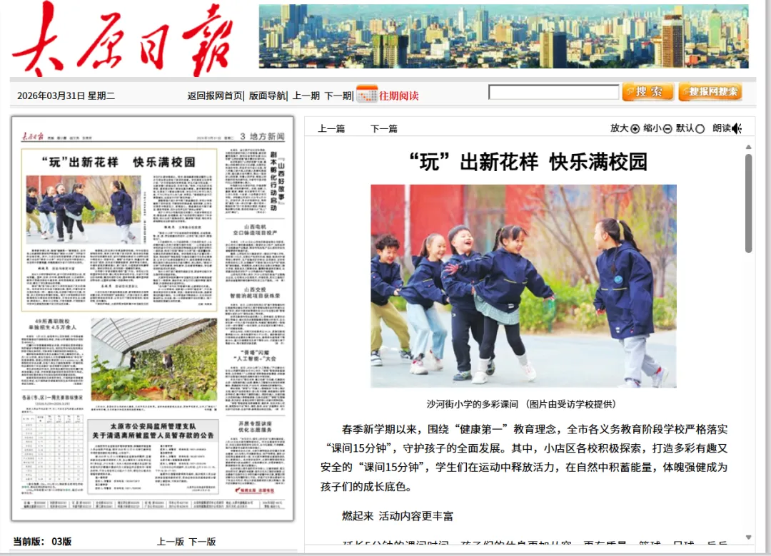 春季新学期以来,围绕“健康第一”教育理念,全市各义务教育阶段学校严格落实“课间15分钟”,守护孩子的全面发展。其中,小店区各校积极探索,打造多彩有趣又安全的“课间15分钟”,学生们在运动中释放活力,在自然中积蓄能量,体魄强健成为孩子们的成长底色。