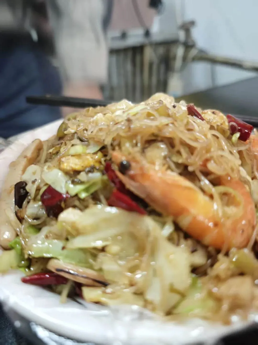 甜虾、鱿鱼给得实在,配上鸡蛋、香菇、酸菜、茴子白,猛火爆炒。锅气是这道菜的灵魂——火候到了,米粉丝滑干爽,每根都裹着酱香,虾和鱿鱼的鲜味被高温逼出来,和酸菜的微酸、茴子白的清甜撞在一起,层次丰富得让人停不下筷。