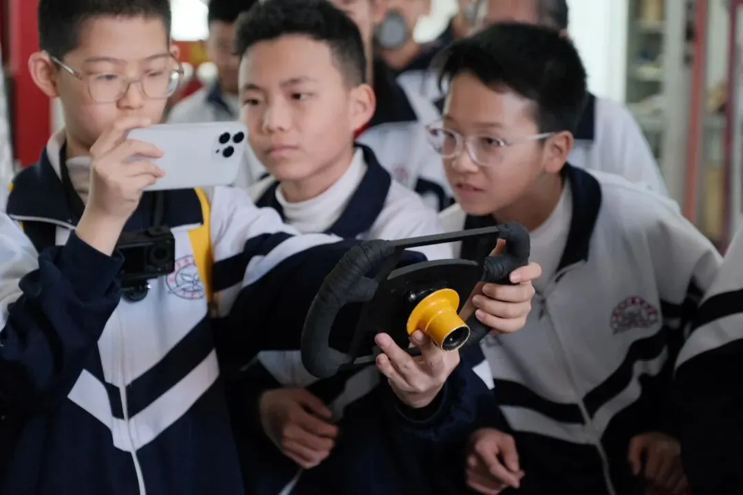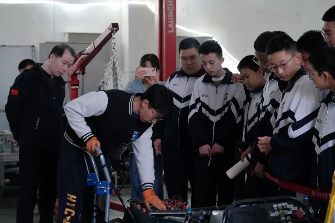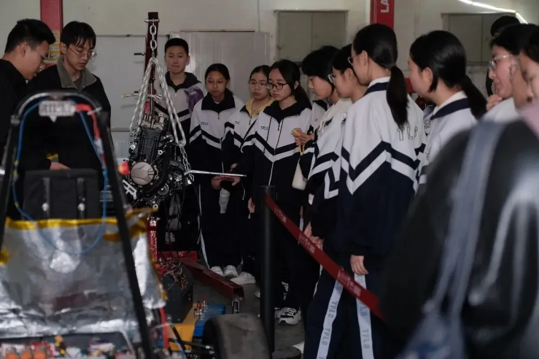 讲解从方程式赛车的设计理念、动力系统的构造,到车辆每一个零件的打磨、每一次赛道测试的迭代。同学们认真聆听、仔细观察,不时提出自己的疑问与思考。同学们在亲手触摸赛车的车身结构、了解车队从图纸到成品的完整研发流程后,课本里的机械原理、工程知识变得鲜活可感,也真切感受到了“把热爱做到极致”的车队精神。