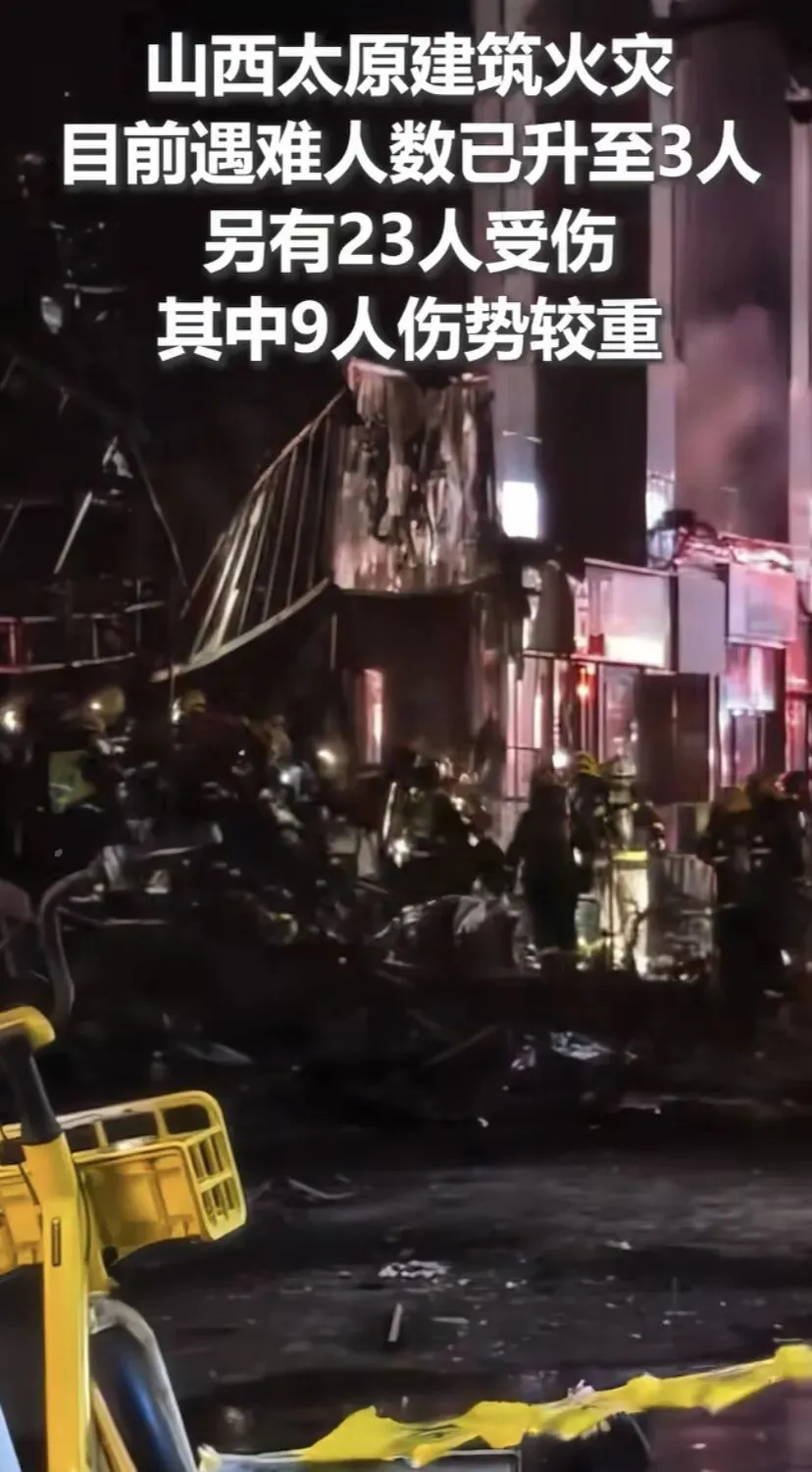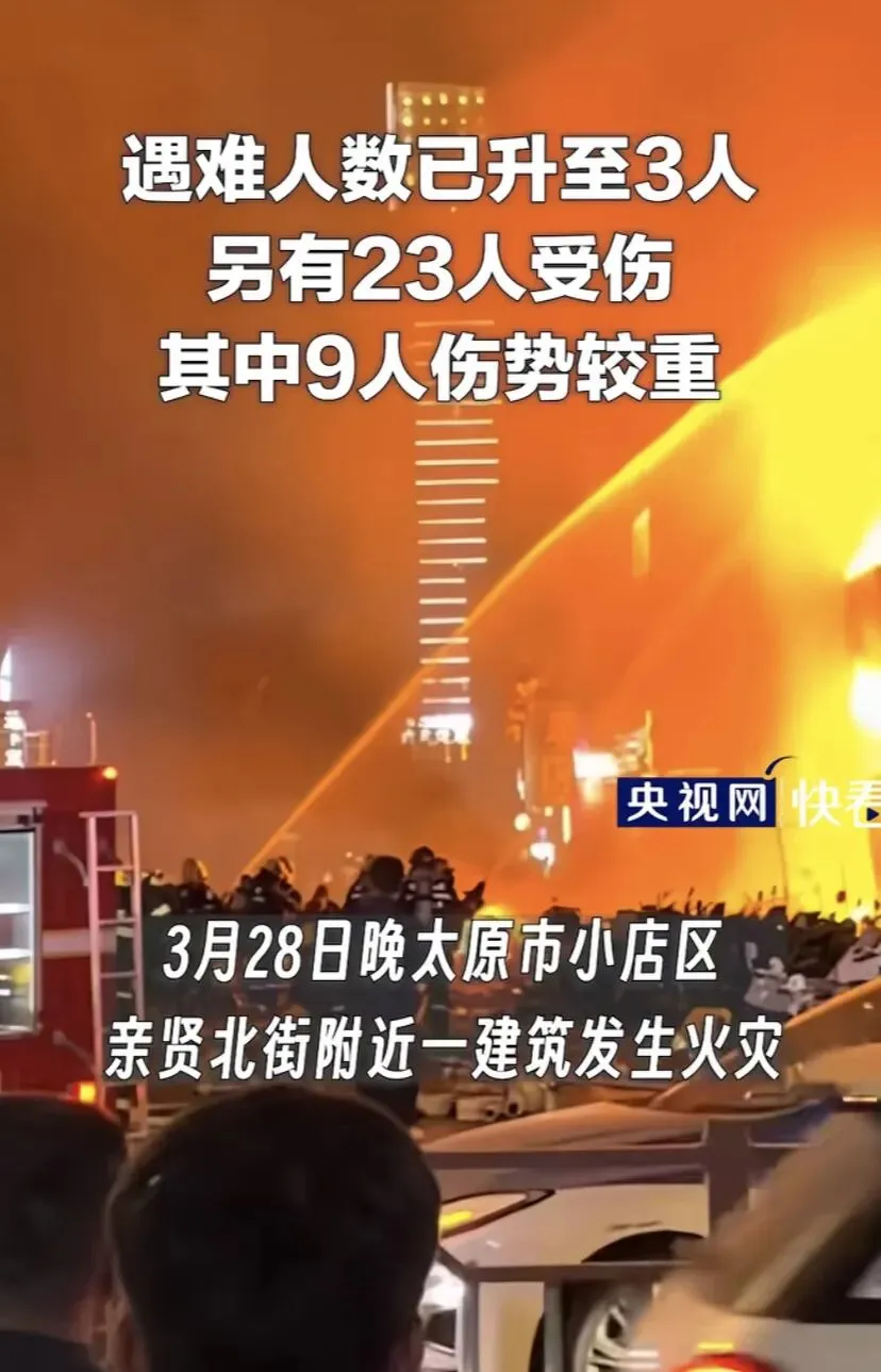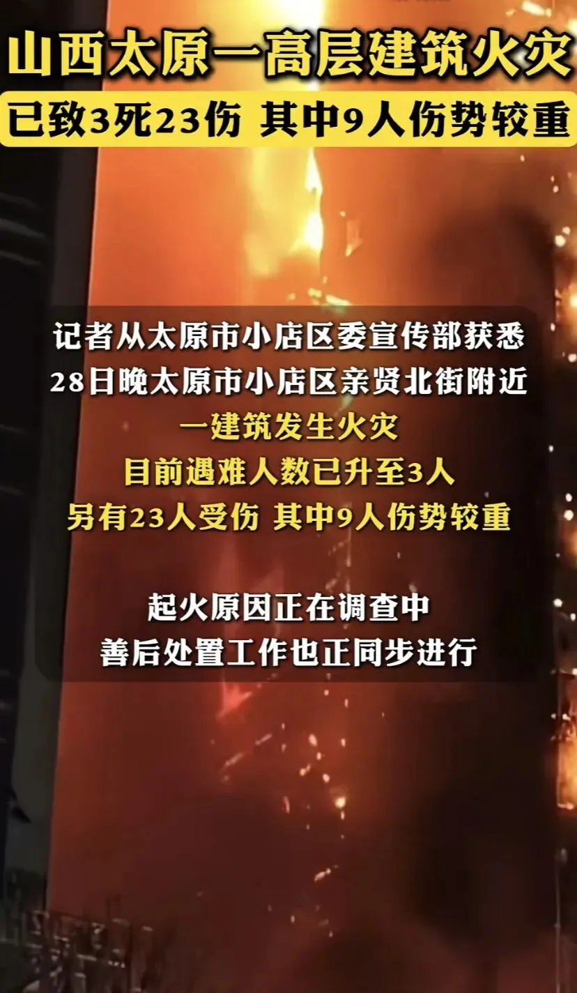 2026年3月28日晚8时许,山西太原小店区亲贤北街核心商圈,一栋集餐饮、酒店、娱乐于一体的高层商住混合建筑突发大火。火势沿外墙极速蔓延,火光冲天、浓烟蔽空,将周末繁华商圈瞬间变为灾难现场。截至3月29日上午,事故已造成3人死亡、23人受伤(9人重伤),明火已扑灭,原因调查与善后处置全面展开。