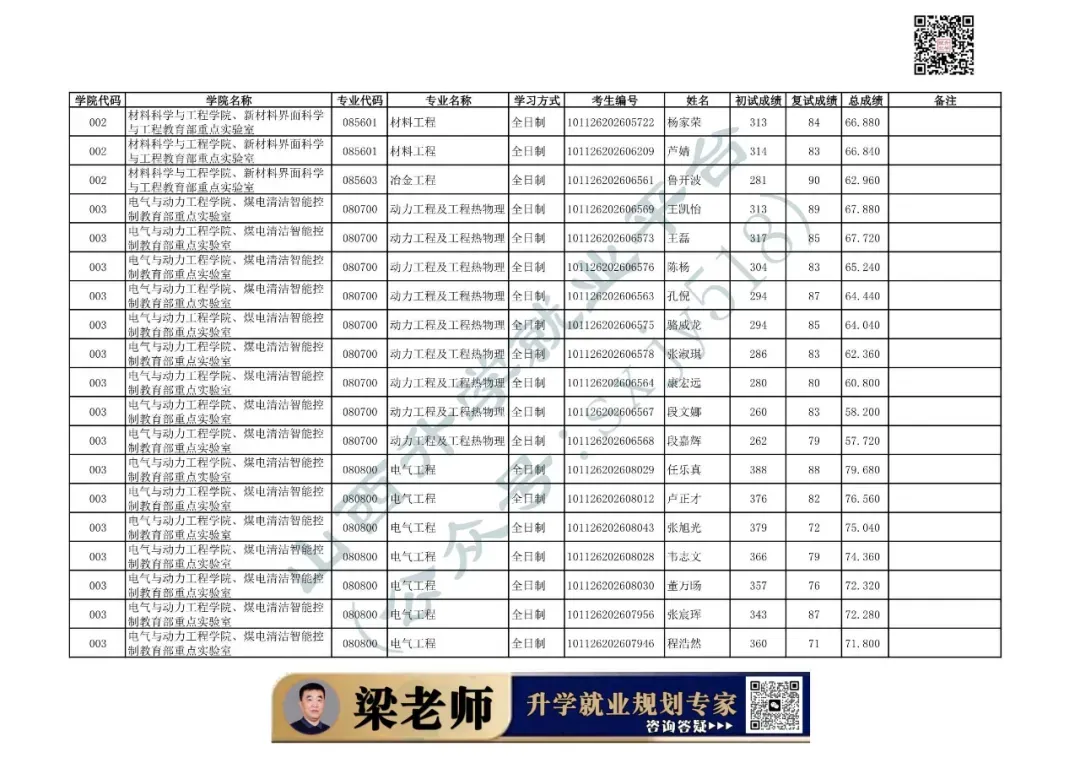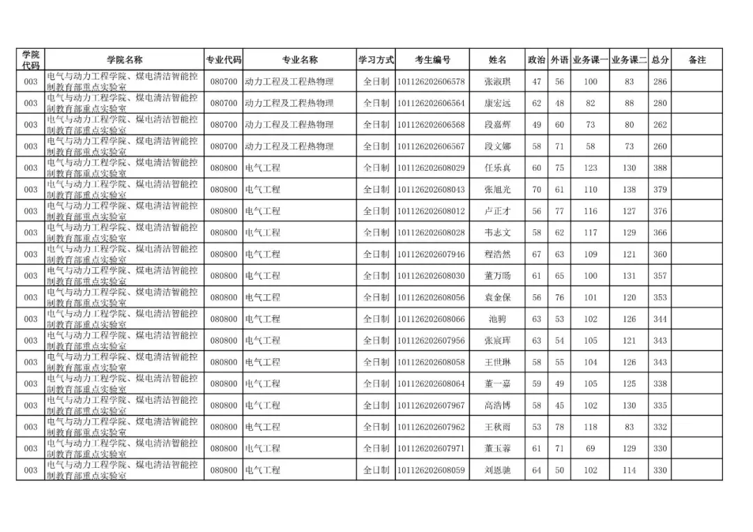 003 | 电气与动力工程学院、煤电清洁智能控制教育部重点实验室 | 080800 | 电气工程 | 全日制 | 101126202699901 | 王磊 |