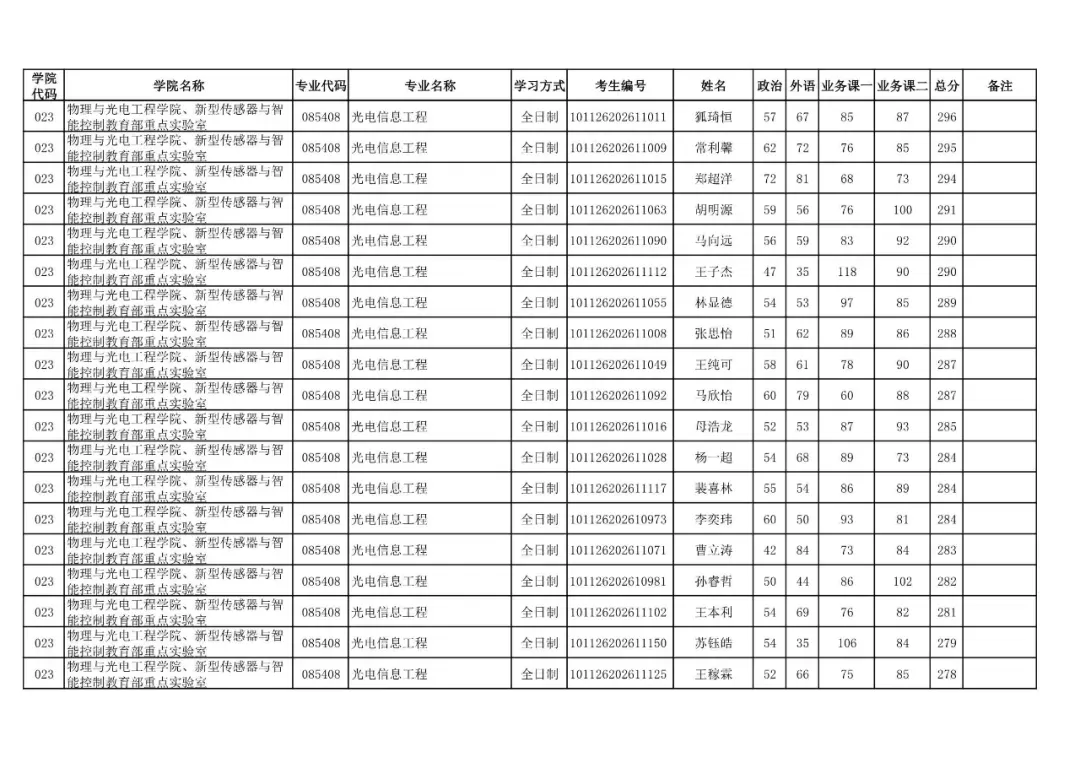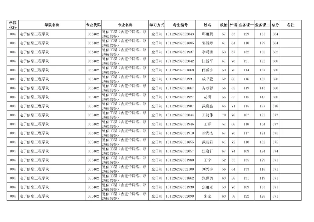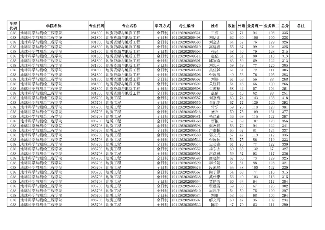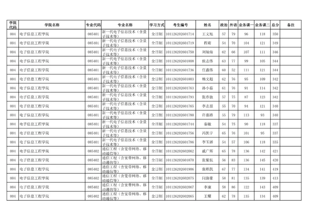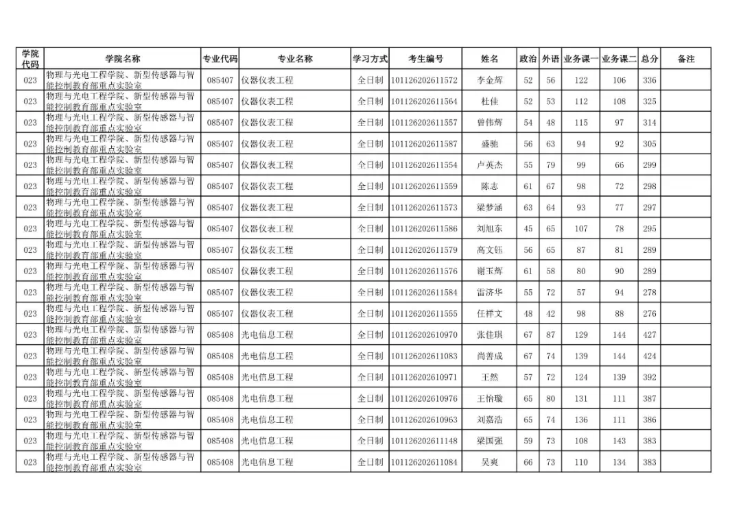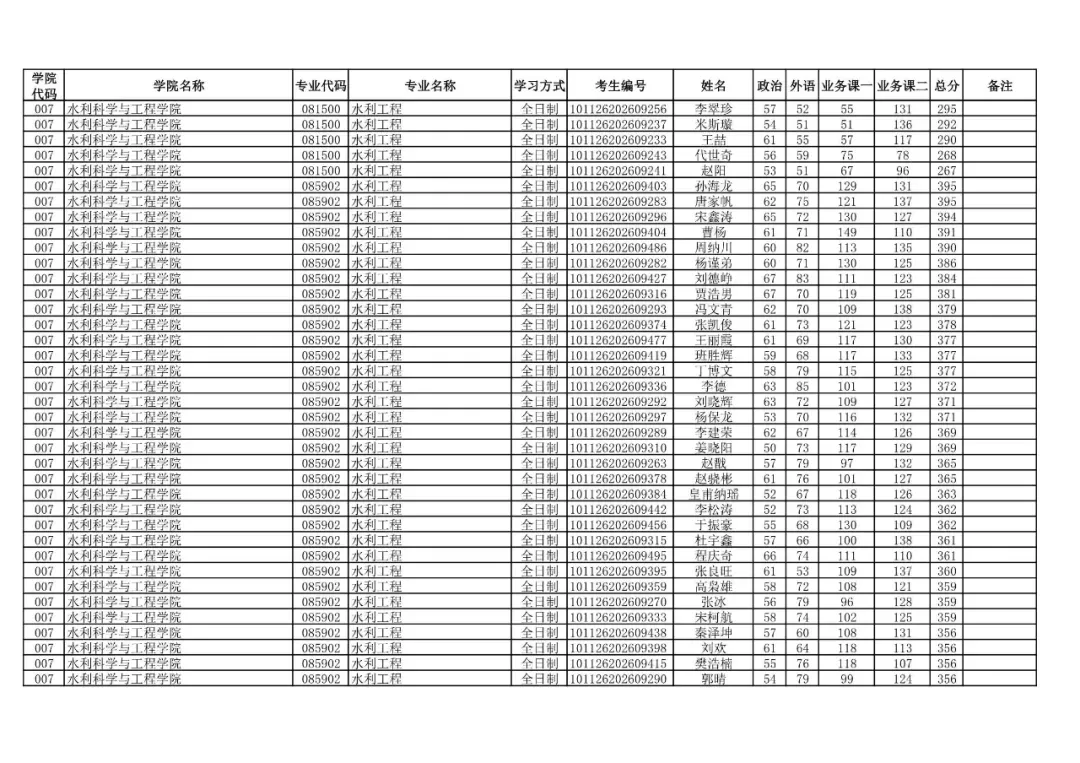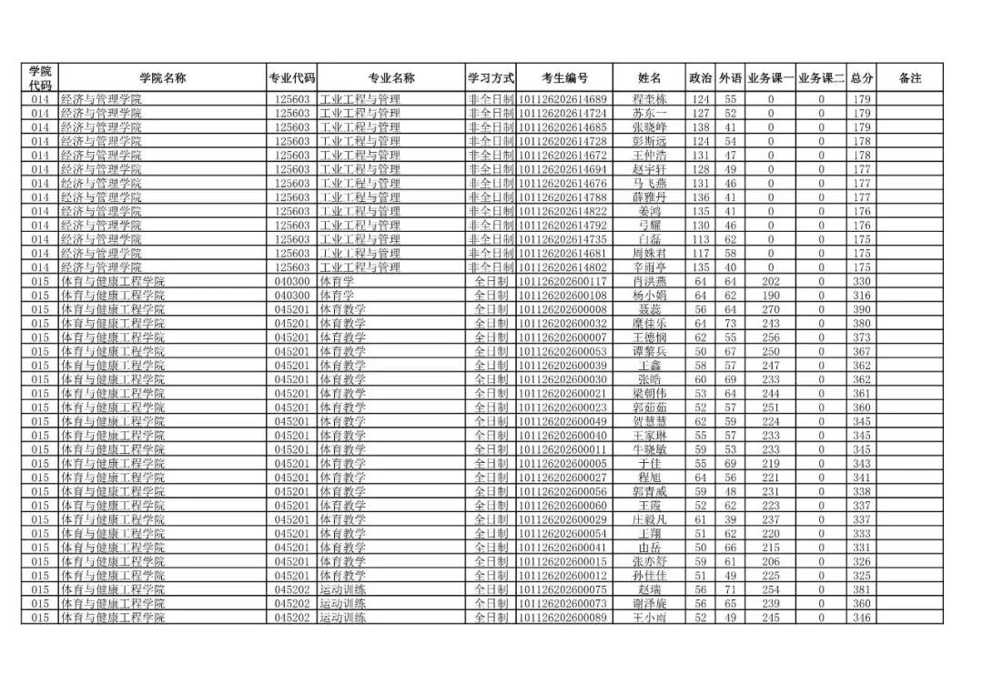 学院代码 | 学院名称 | 专业代码 | 专业名称 | 学习方式 | 考生编号 | 姓名 |