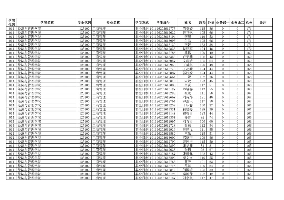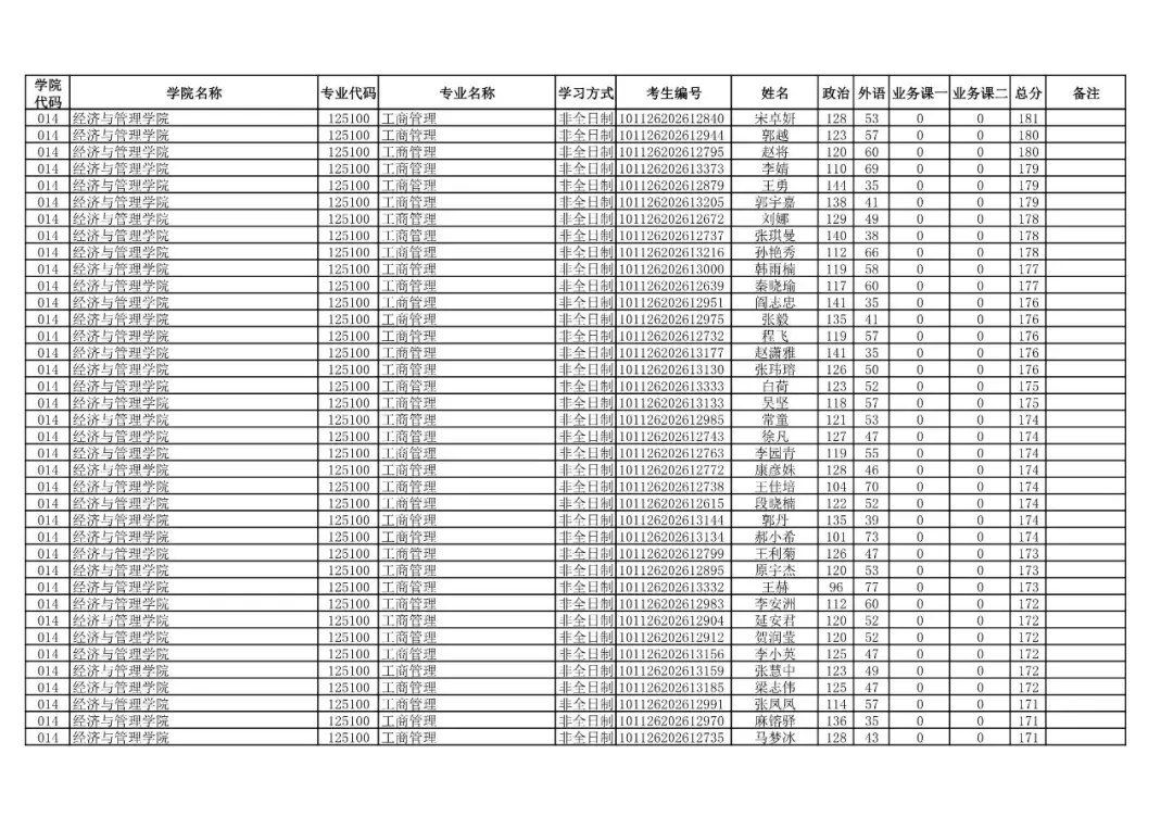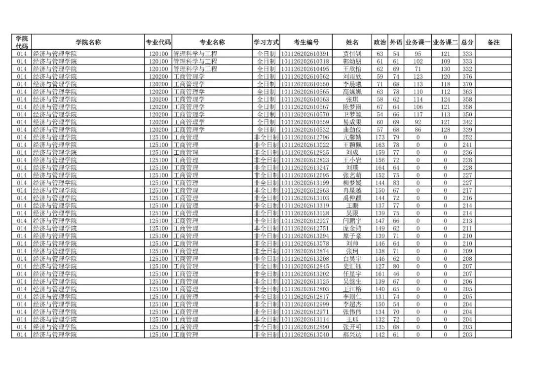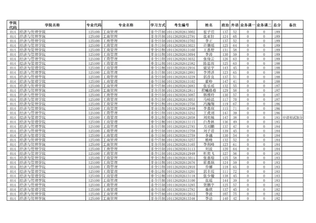 014 | 经济与管理学院 | 125100 | 工商管理 | 非全日制 | 101126202699912 | 程洋 |