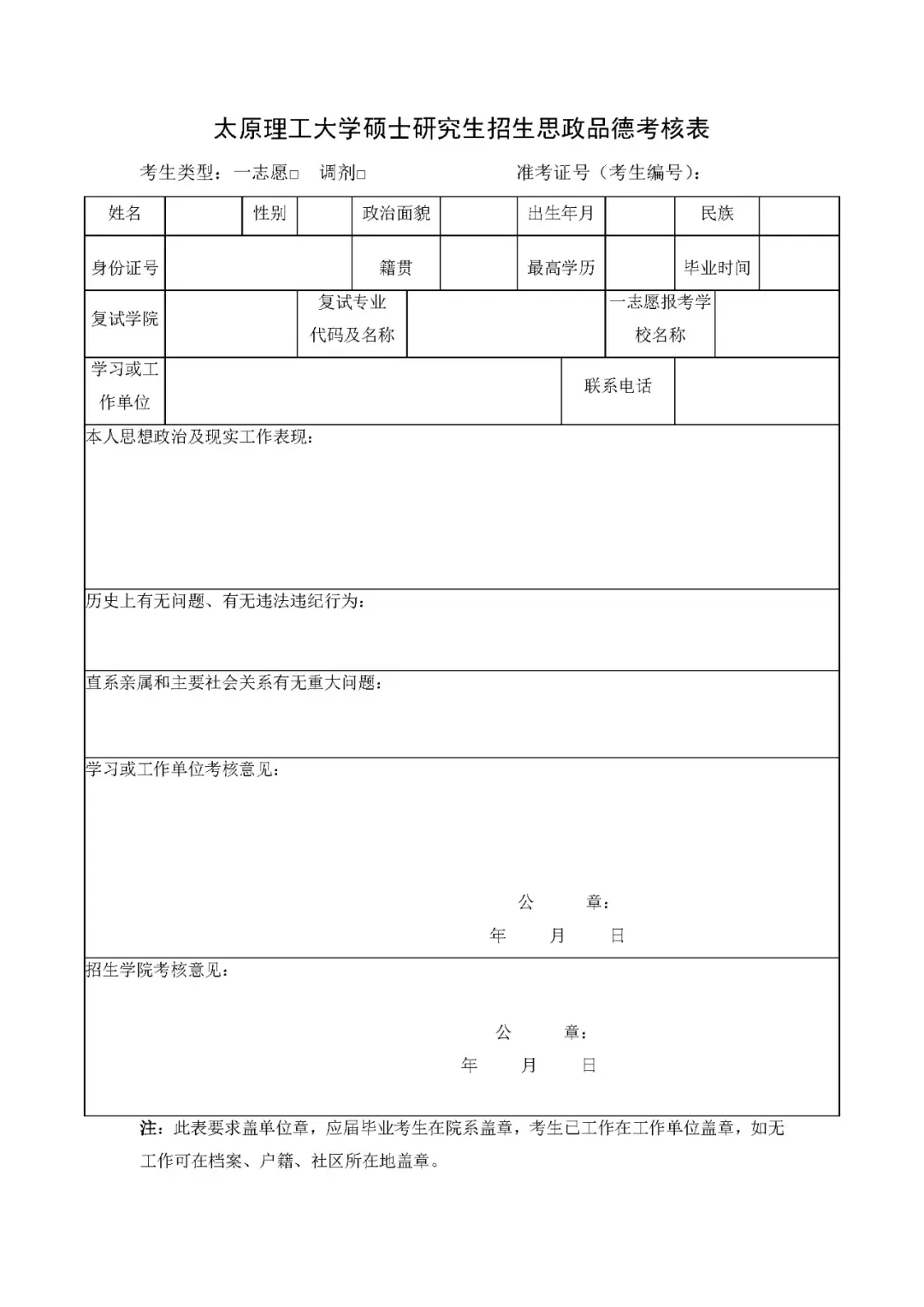 参加复试的考生须将完成审查并盖章的《太原理工大学硕士研究生招生思政品德考核表》(附件1)在复试时交学院复试小组。填报注意事项如下: