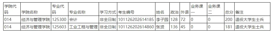 我校 2026 年“退役大学生士兵专项计划”复试分数线为:总分及单科不低于教育部划定的“2026年全国硕士研究生招生考试考生进入复试的初试成绩基本要求(A类考生)”相应学科专业的要求。现将符合条件参加复试的名单公示如下:
