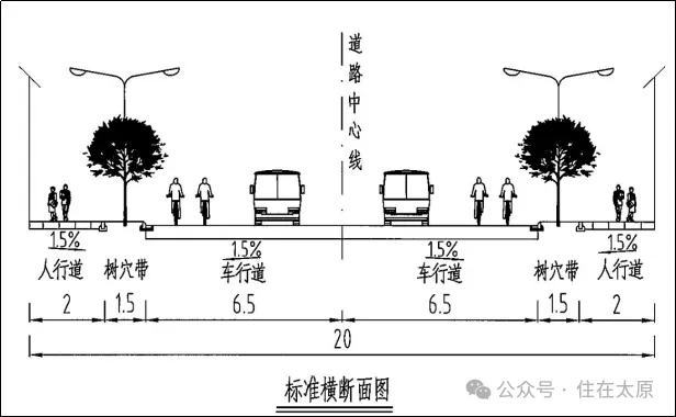 纵一路至东峰路段规划红线宽30米,横断面布置为三块板断面,中间15.7米机动车道,两侧各1.5米绿化带、2.5米非机动车道、3.15米人行道(含树穴带)。