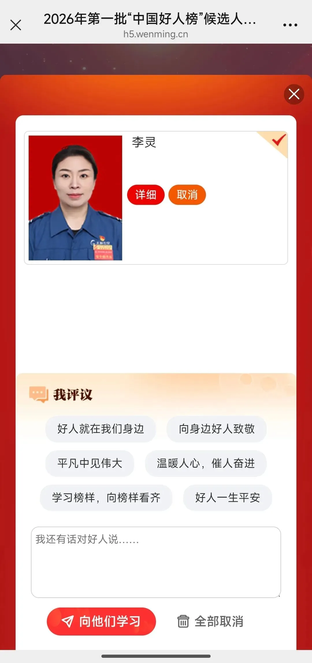 其中,由太原市推荐的李灵作为候选人进入事迹展示评议【评议时间】:2026年3月31日—2026年4月7日