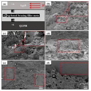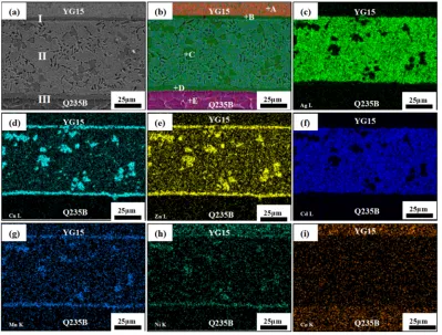 4.元素扩散:Co从YG15侧向钎料层与Q235B侧扩散,Mn、Ni可去除母材氧化膜,促进结合;Zn、Cd挥发是接头微孔洞的主要成因。
