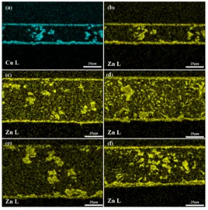 图3 不同钎焊温度下Cu-Zn固溶体分布图:(a)660℃钎焊接头Cu元素面扫描图;(b)660℃钎焊接头Zn元素面扫描图;(c)680℃钎焊接头Zn元素面扫描图;(d)700℃钎焊接头Zn元素面扫描图;(e)720℃钎焊接头Zn元素面扫描图;(f)740℃钎焊接头Zn元素面扫描图