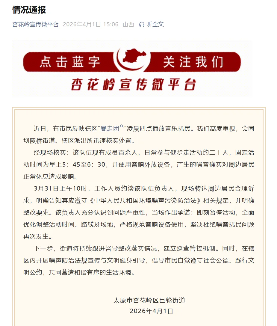 太原通报“'暴走团'凌晨四点播放音乐扰民”:队伍现有成员百余人,日常参与健步走活动约二十人,已约谈负责人,承诺即刻暂停活动
