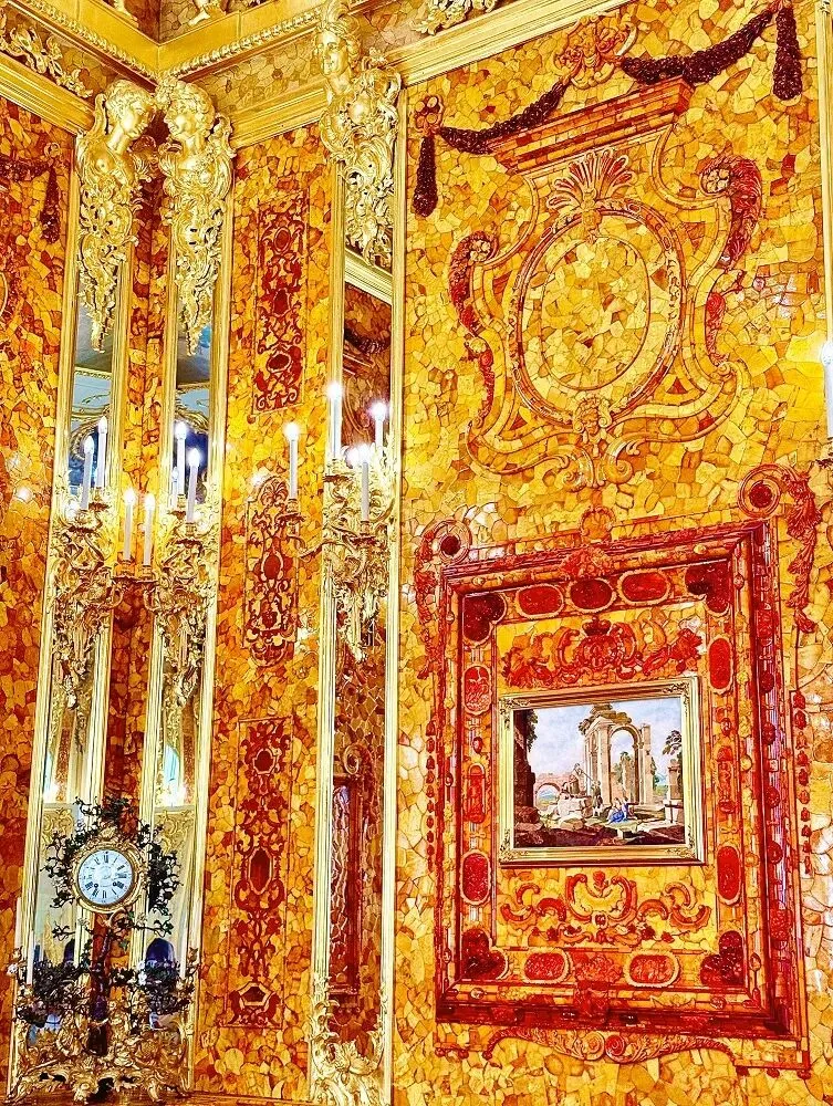 叶卡捷琳娜宫又称皇村,原为皇家消夏别墅,后经多次扩建修缮。现存建筑以黄金大厅和复原的琥珀宫闻名,宫外则是典型英式自然风景园林,景致开阔雅致。