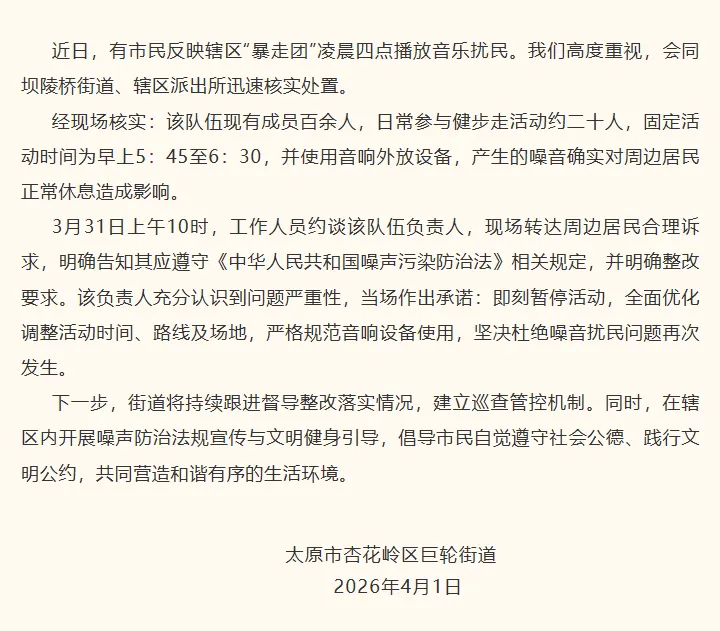 3月31日上午10时,工作人员约谈该队伍负责人,现场转达周边居民合理诉求,明确告知其应遵守《中华人民共和国噪声污染防治法》相关规定,并明确整改要求。该负责人充分认识到问题严重性,当场作出承诺:即刻暂停活动,全面优化调整活动时间、路线及场地,严格规范音响设备使用,坚决杜绝噪音扰民问题再次发生。