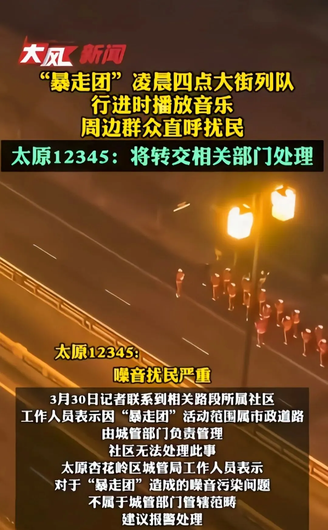 近日,太原一“暴走团”于凌晨四五点,在道路上播放着高分贝音乐健走,全然不顾周边居民的休息权益,影响了周边居民的休息。