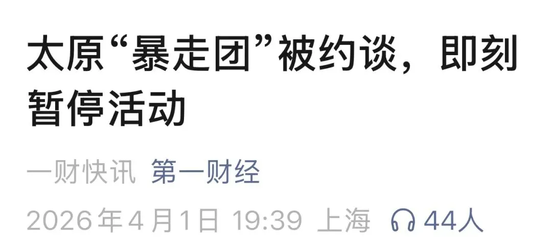内容简介:太原暴走团被约谈后,负责人承诺整改。但我们要问:如果没有投诉,没有曝光,没有约谈,他们会不会主动意识到问题?