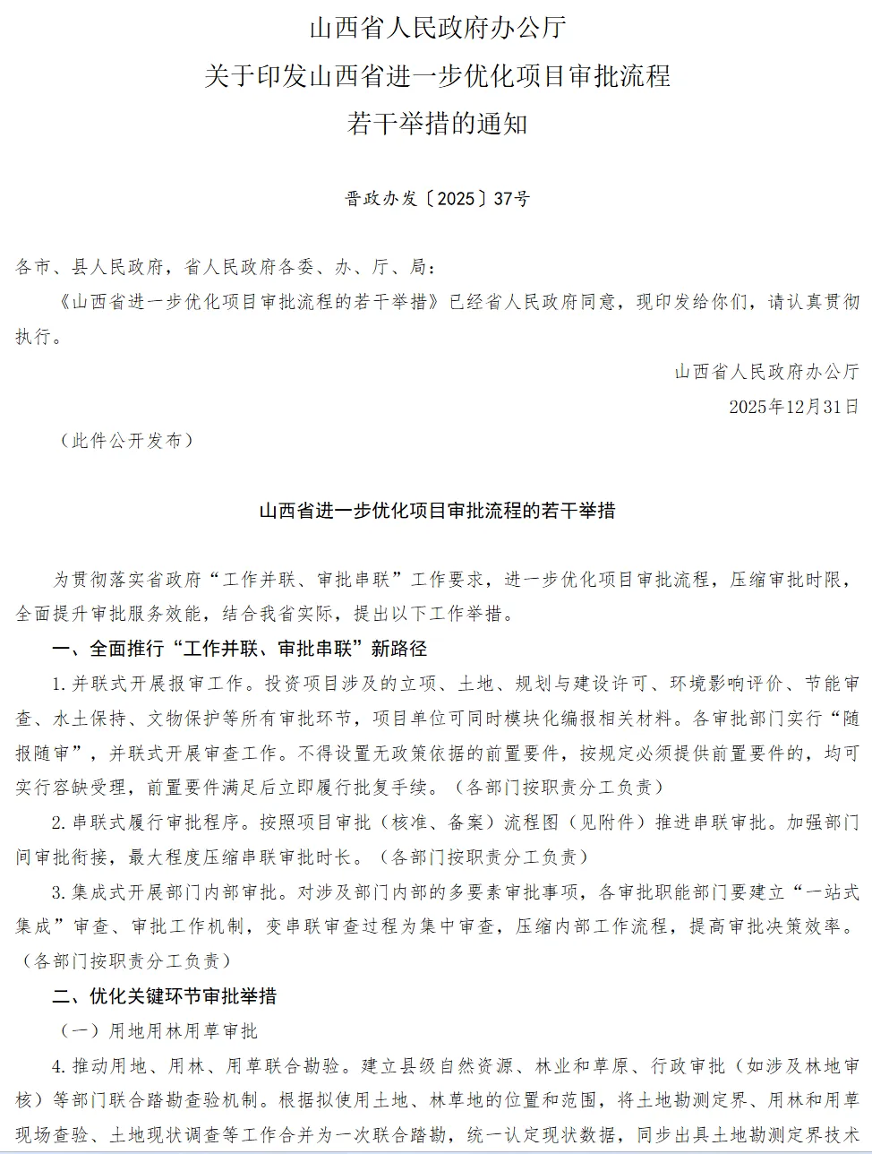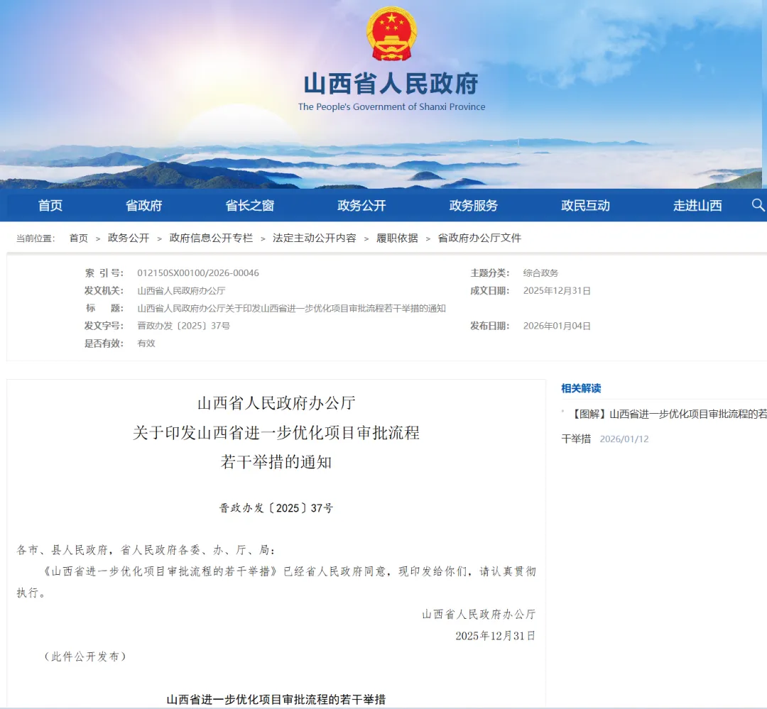 2025年12月31日,山西省人民政府办公厅印发了《关于印发山西省进一步优化项目审批流程若干举措的通知》(晋政办发〔2025〕37号),文件明确了备案类项目的工作路线图。