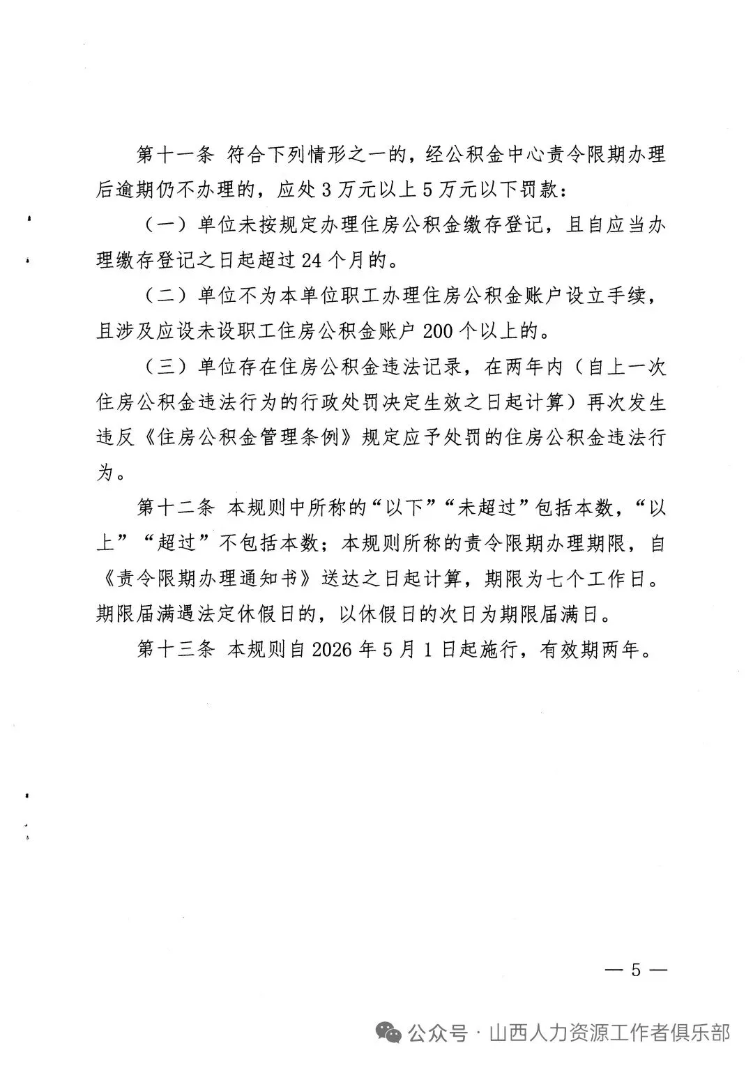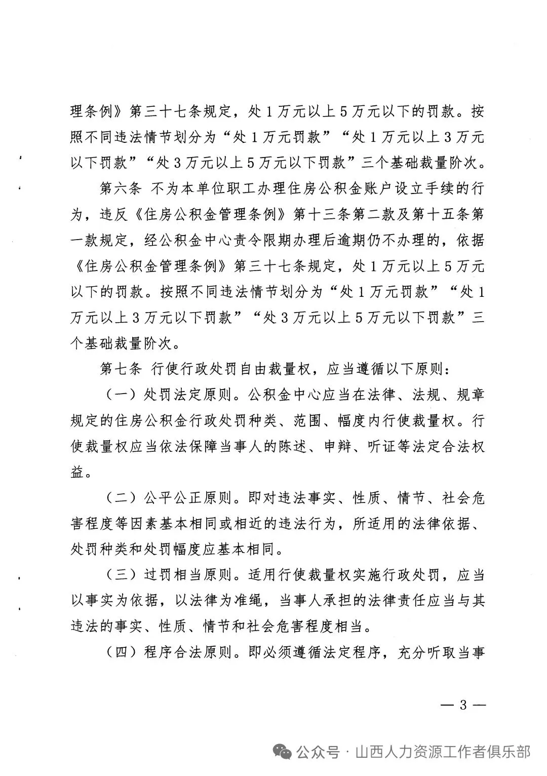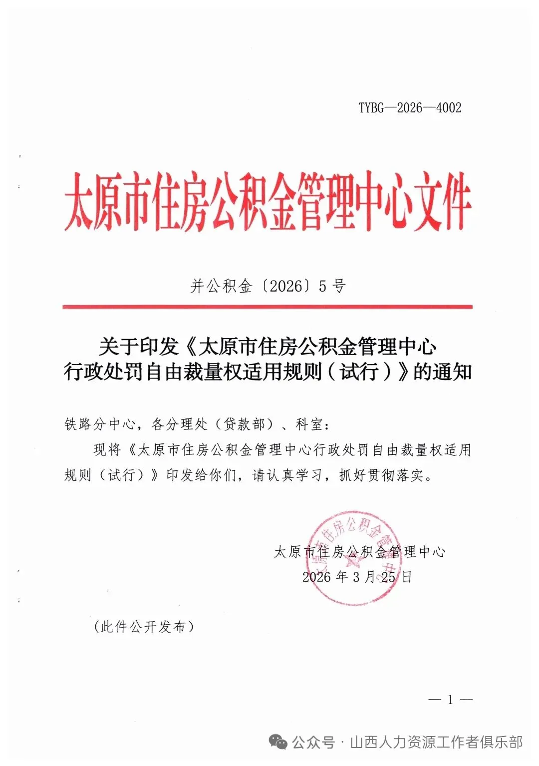 近日,太原市住房公积金中心印发红头文件。其中,对不办理住房公积金缴存登记的行为,违反《住房公积金管理条例》第十三条第二款及第十四条第一款规定,经公积金中心责令限期办理后逾期仍不办理的,依据《住房公积金管理条例》第三十七条规定,处1万元以上5万元以下的罚款。按照不同违法情节划分为"处1万元罚款""处1万元以上3万元以下罚款""处3万元以上5万元以下罚款"三个基础裁量阶次。