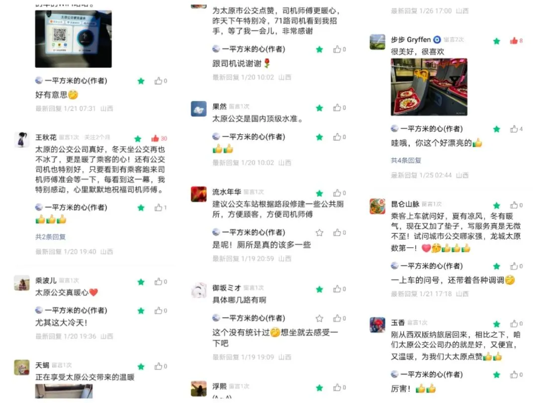 除了得到很多人对太原的褒奖和赞赏,有些人甚至把我这里当成了“市长信箱”,他们给太原的公交提意见,说哪些地方该开通公交车,哪些地方该怎么怎么样,我感觉大家对公交车挺关注的。慢慢的,一天一天坐了很多次公交车和大花坐垫。刚开始的花坐垫,崭新,它后面有一个简单的绳子系住,有些绳子已经拖到地上。当时我还想重新系一下,但觉得结打不开,就没有折腾。后来大家都说到公交车上有花坐垫,还有WiFi都对公交车评价很高。寒冷的冬天就这样过去了。