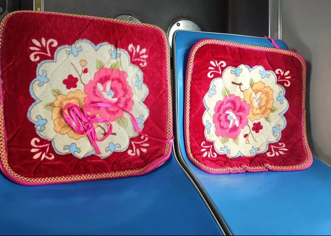 冬去春来,上周五,我再次坐上公交车时,又看到了大花坐垫。那天天气非常热,心里闪过一个念头,这花坐垫应该可以取了吧。临下车时,看到有些上了年纪的老人,起身不着急往门口走,而是先把垫子放回原处。有些拴着的绳子结已经完全解开,有些绳子已经看不见了,但垫子好像已经和座位非常吻合,贴合在了一起,不管人们怎么坐,它都不会掉下来。老人们像坐自己的沙发一样,在起立时把沙发巾在捋顺了,那一刻,公交车仿佛成了一个移动的“家”,而大花坐垫就是这个家里最显眼的温情符号。