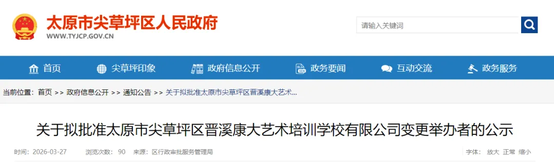 关于拟批准太原市尖草坪区晋溪康大艺术培训学校有限公司变更举办者的公示根据《中华人民共和国民办教育促进法》第五十四条、《中华人民共和国行政许可法》第三十六条等有关规定,依申请,经审查拟批准太原市尖草坪区晋溪康大艺术培训学校有限公司变更举办者予以公示。