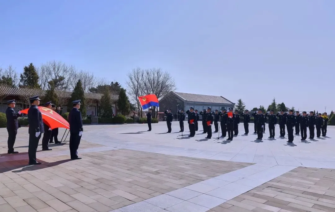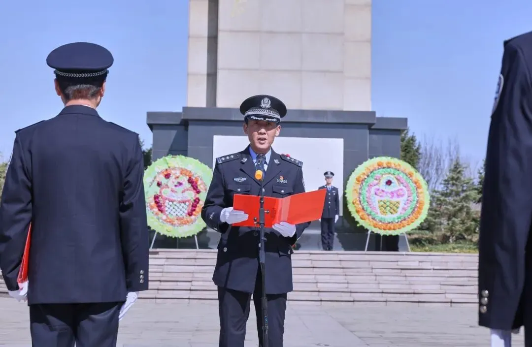 在革命烈士纪念碑前,面对鲜红党旗,公安处党委副书记、政委武辉章带领全体干部民警高举右拳,重温入党誓词。铿锵的誓言,在青山绿水间久久回响。