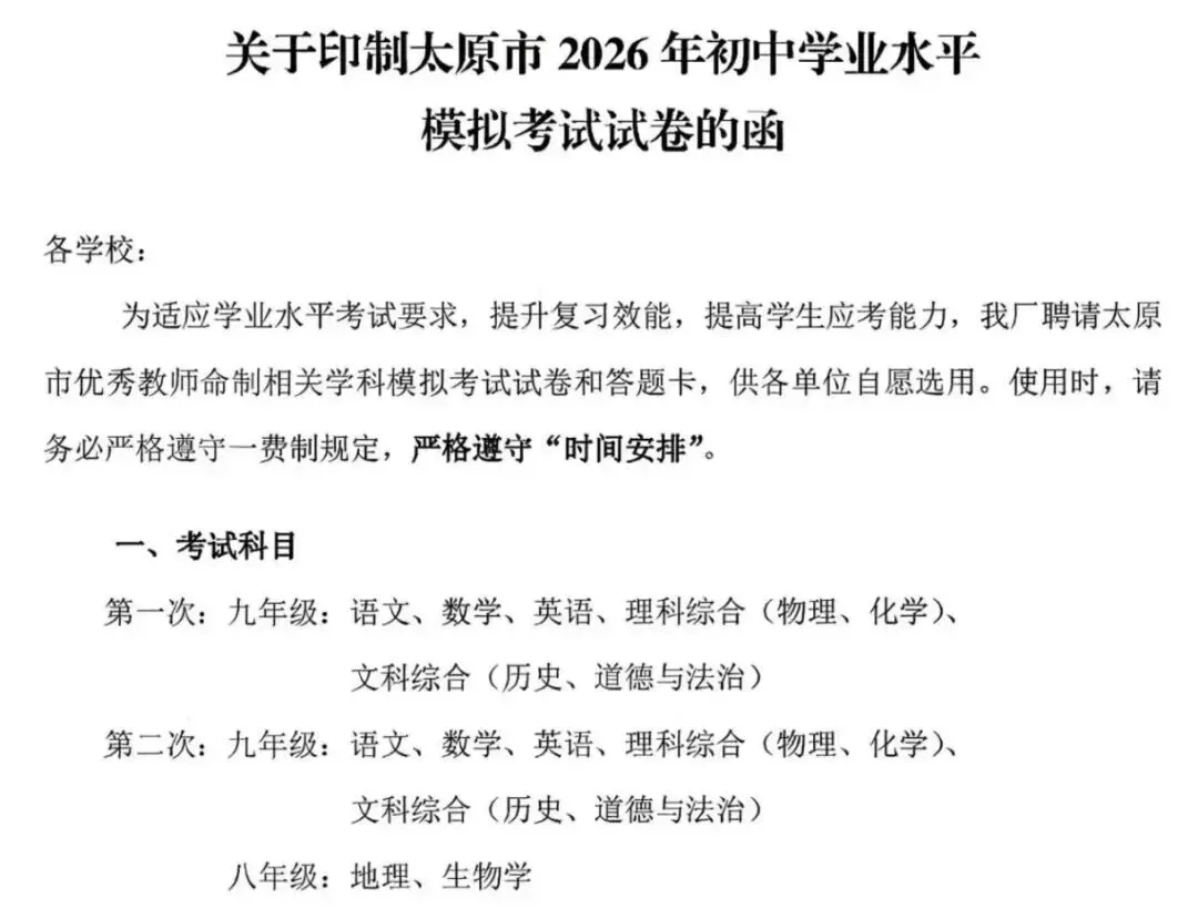 初三的同学们,2026年太原中考一模、二模的时间已公布,分别在4月中旬和5月下旬。来看看具体的考试安排吧。