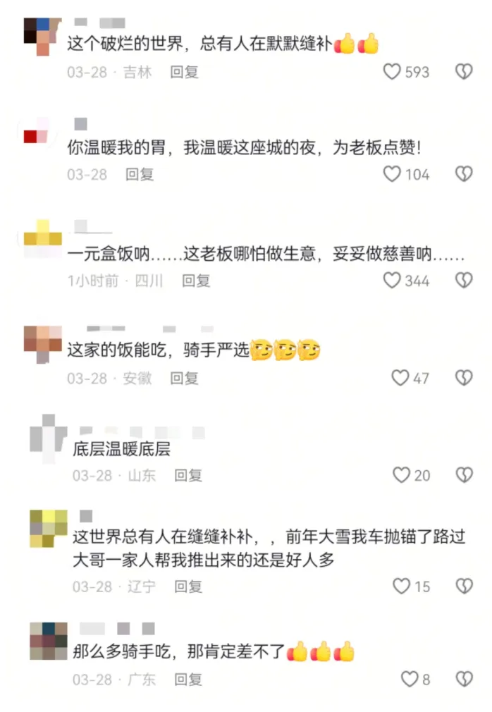 老板没算过这笔账,“没想过赚钱,也没想过亏不亏。人家跑了一天,大晚上的能吃口热乎饭,挺好。”有人问这样做值吗?他说:“这有什么值不值的?又不是做生意,就是顺手的事。”