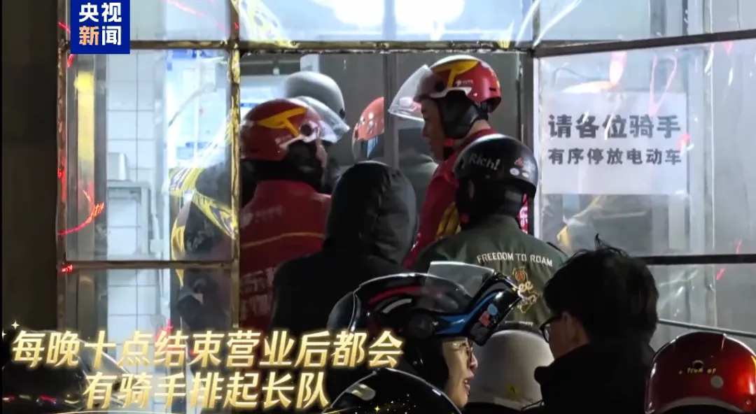 每天晚上10点餐馆闭餐后,店门前就排起长队——结束晚高峰配送的外卖员们花一元钱,就能买到一份包含三四个菜的热乎盒饭。