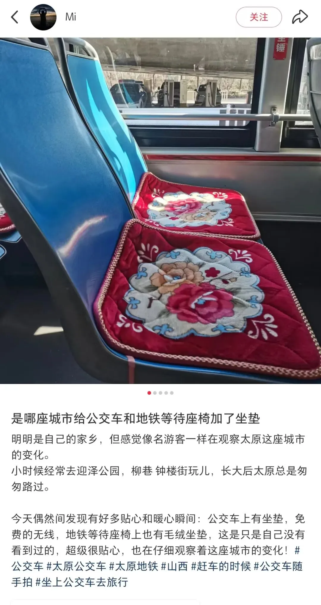 而城市的温柔不止在街角,也在每天陪伴市民出行的公交车上。每年冬天,公交座椅总是冰凉。今年,太原公交车辆座椅统一加装了保暖坐垫,整齐洁净的坐垫铺满座椅,乘客落座瞬间便能远离寒意。这份看得见、摸得着的温暖,赢得了市民纷纷点赞:“以前冬天坐车得垫着外套,现在有了专属坐垫,坐上去暖乎乎的,公交服务越来越周到了!”