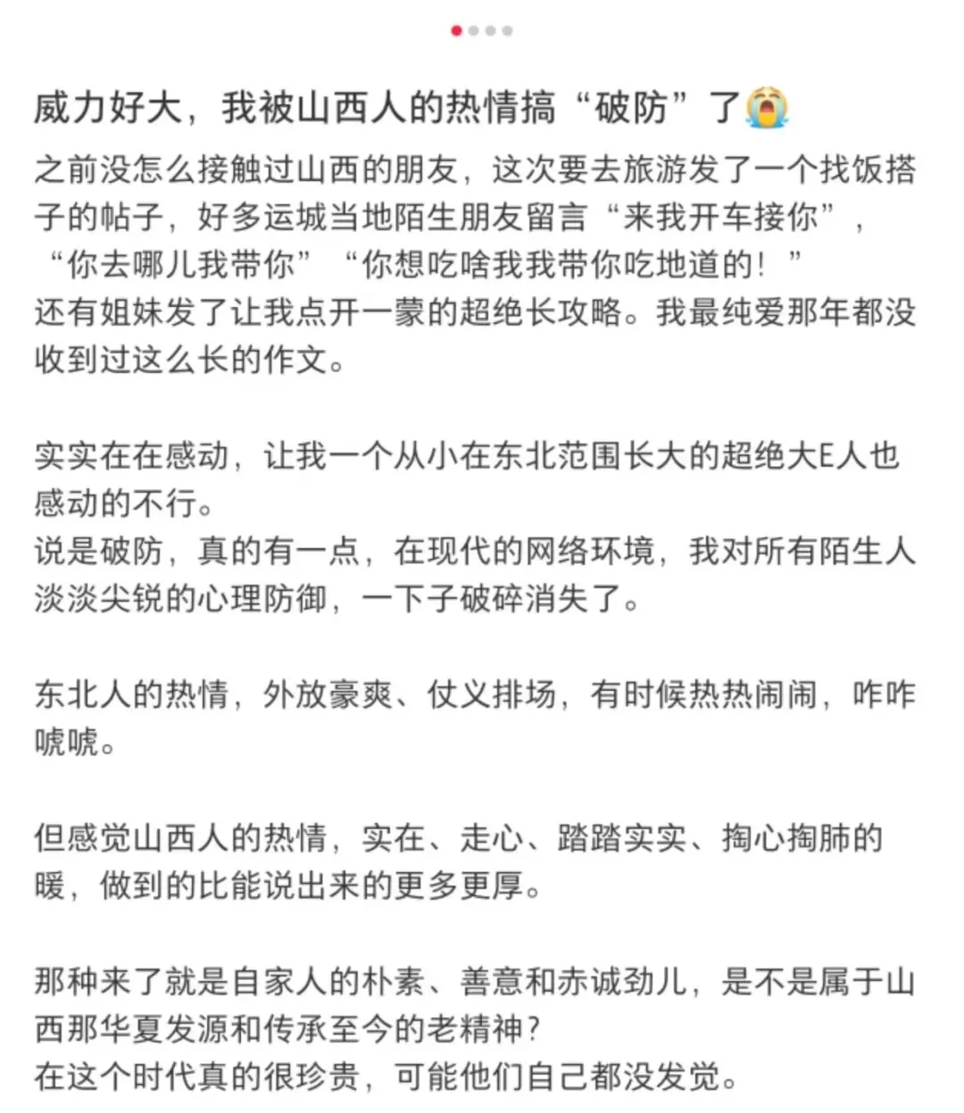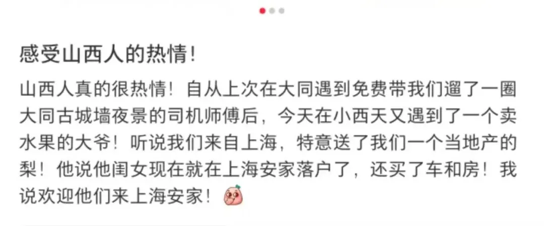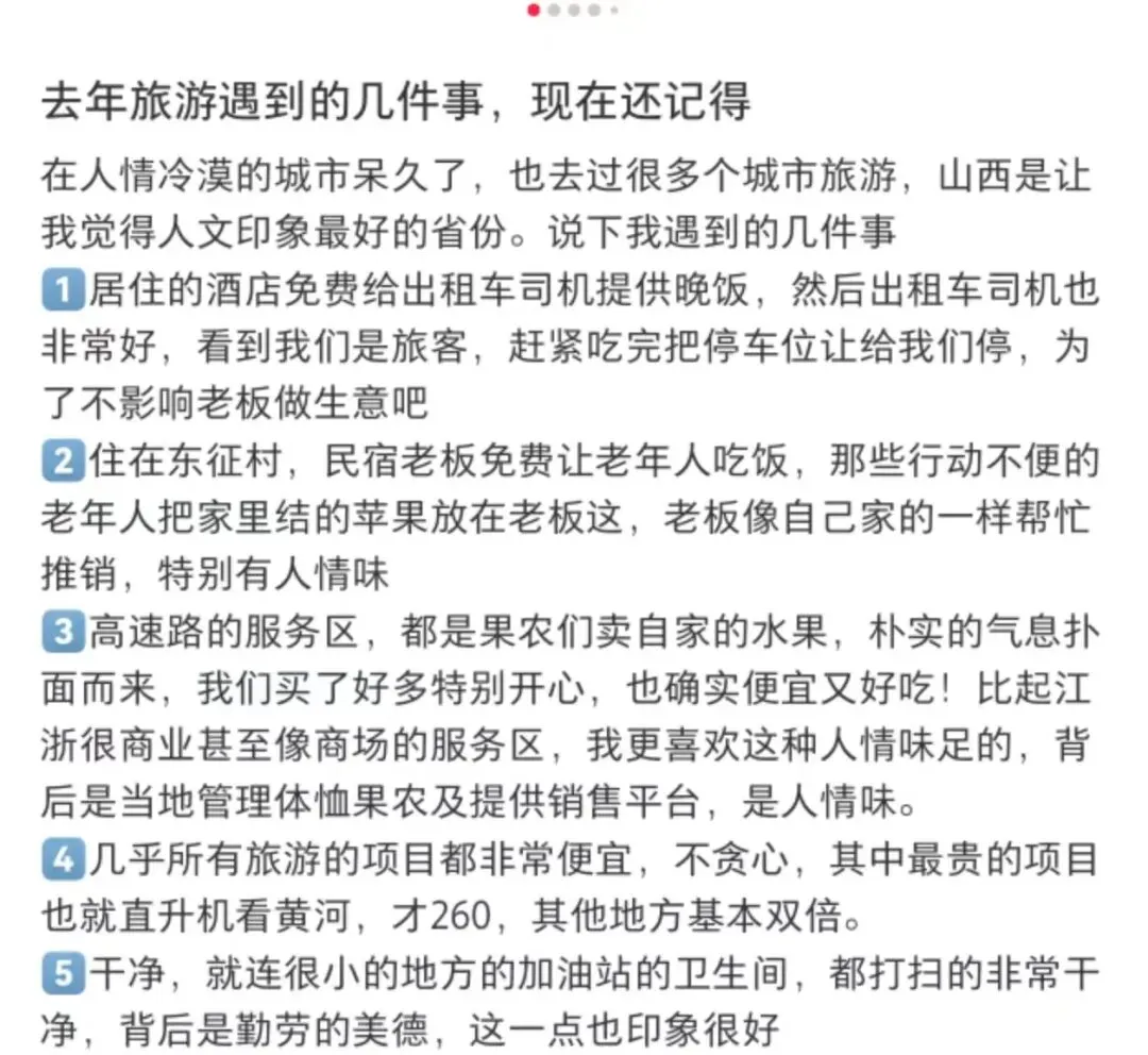 各大活动期间的免费接驳专线、伴手礼、免门票服务,互联网上山西网友对外地游客的耐心“云导游”,节假日里山西人“让景于客”的慷慨……这些看似微小的举动,让这片本就美丽的土地焕发出更加耀眼夺目的光彩。