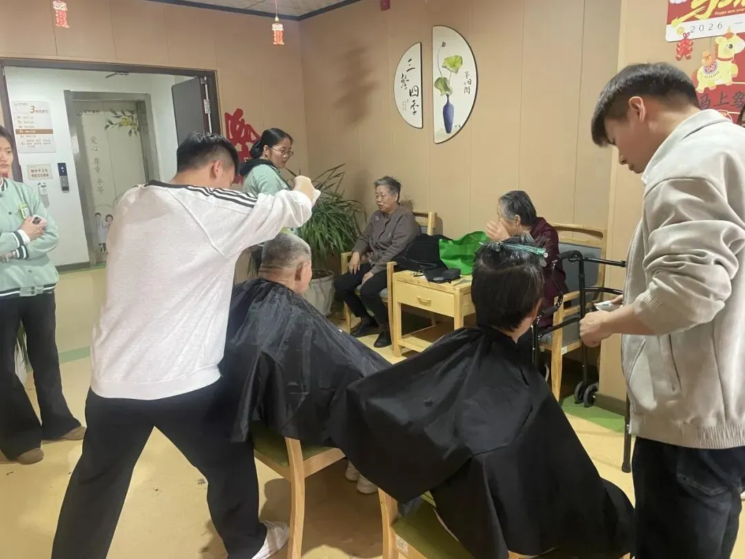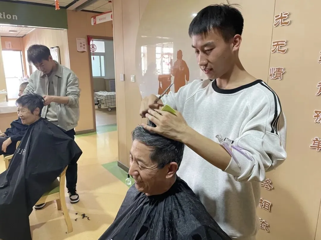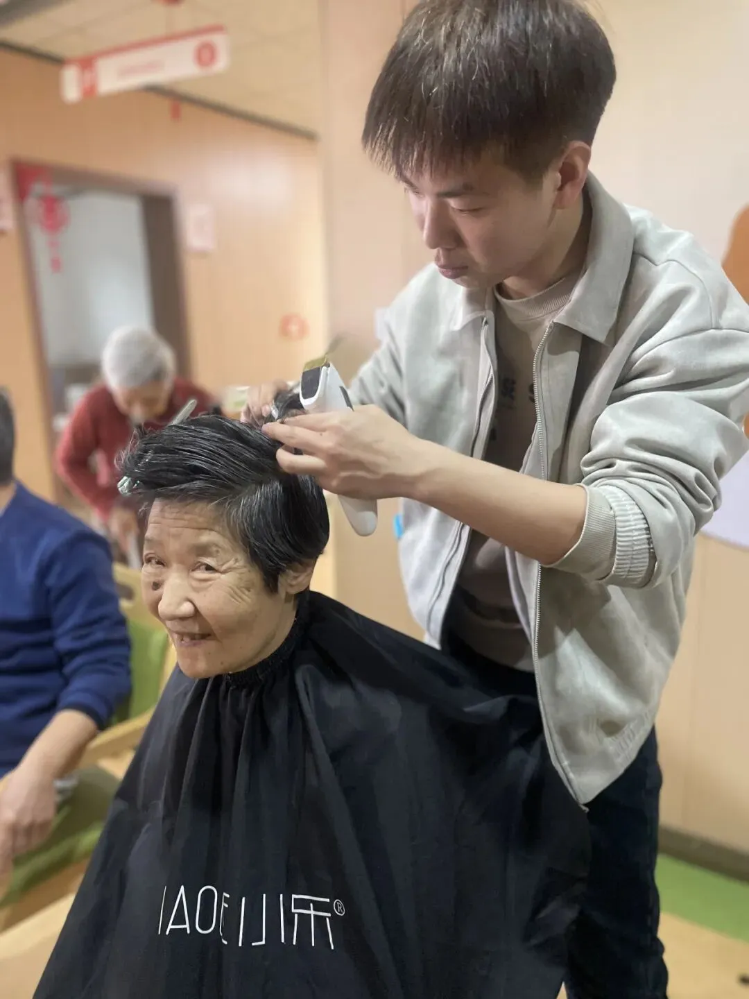 从围布的细心调整,到发型的反复确认,再到碎发的细致清理,志愿者们用专业的手艺、耐心的服务,让每一位老人都感受到了家一般的温暖。对于长期在护理院生活的老人们来说,这不仅是一次理发,更是一份被牵挂、被重视的幸福感。