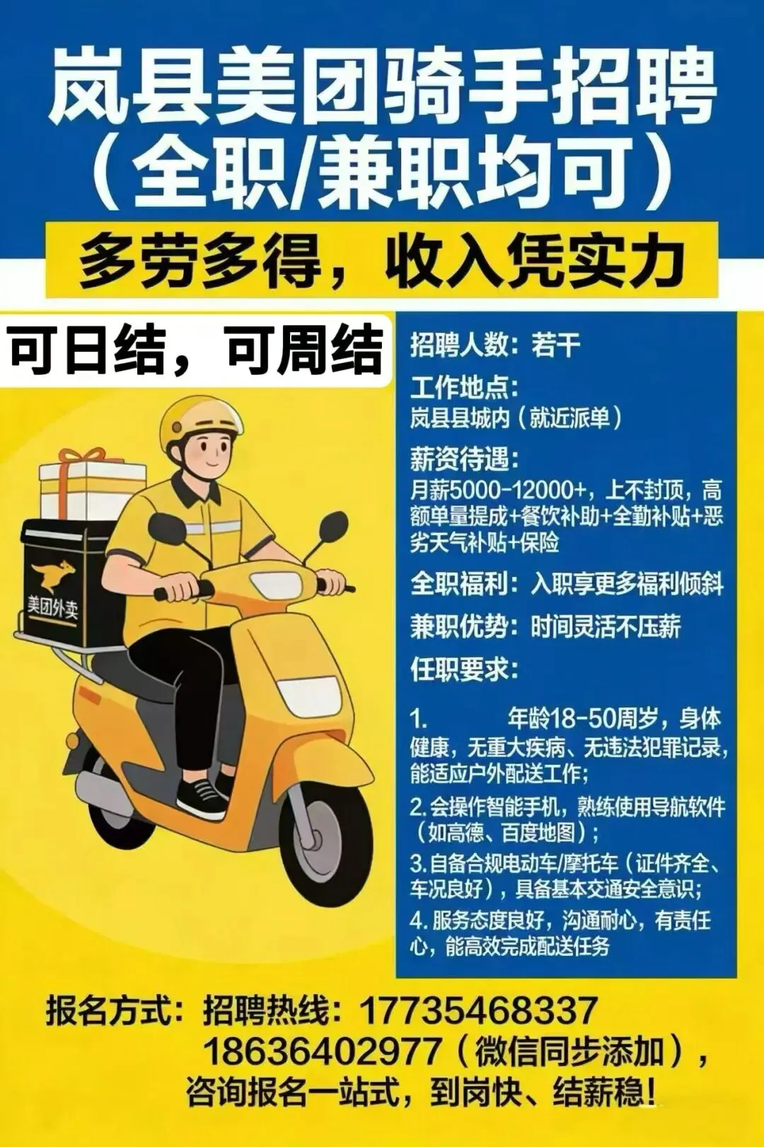 忻州沙,免筛沙,粗沙,每方110,石子,白灰,红砖,水泥,混凝土 ,小挖机,4.2翻斗车,地址东阳间梁顶。联系17535821638”15525829892,,15135461311需要找工作的朋友们不需要去远方了,家乡就是好地方,各企业大量招聘,名额有限💢可以见面详谈💢也可以进群咨询❗❗高额单量提成+餐饮补助+全勤补贴+恶劣天气补贴+保险。多劳多得,收入完全凭实力;全职入职享更多福利倾斜,兼职时间灵活不压薪。1. 本地工作:无需背井离乡,熟悉街道跑单更高效,兼顾家庭与收入2. 门槛超低:不限学历、不限经验,零基础可快速上手,专人简单指导3. 时间自由:自主安排接单时段,全职/兼职均可,适配各类时间需求1. 年龄18-50周岁,身体健康,无重大疾病、无违法犯罪记录,能适应户外配送工作2. 会操作智能手机,熟练使用导航软件(如高德、百度地图)3. 自备合规电动车/摩托车(证件齐全、车况良好),具备基本交通安全意识4. 服务态度良好,沟通耐心,有责任心,能高效完成配送任务💬 微信同步添加,咨询报名一站式,到岗快、结薪稳!岚县美团本地配送团队,深耕本地生活服务,团队氛围融洽,配送区域固定,跑单路线熟悉,薪资结算及时,为本地骑手提供稳定、靠谱的赚钱平台,欢迎有干劲、想赚钱的老乡加入!