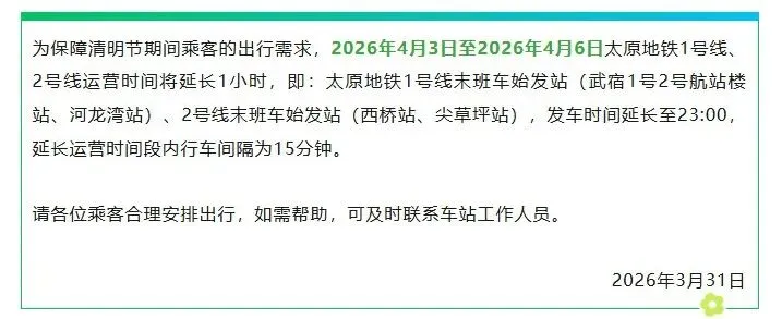 ⏰ 末班车新时间太原地铁1号线、2号线末班车始发站发车时间延长至23:00。