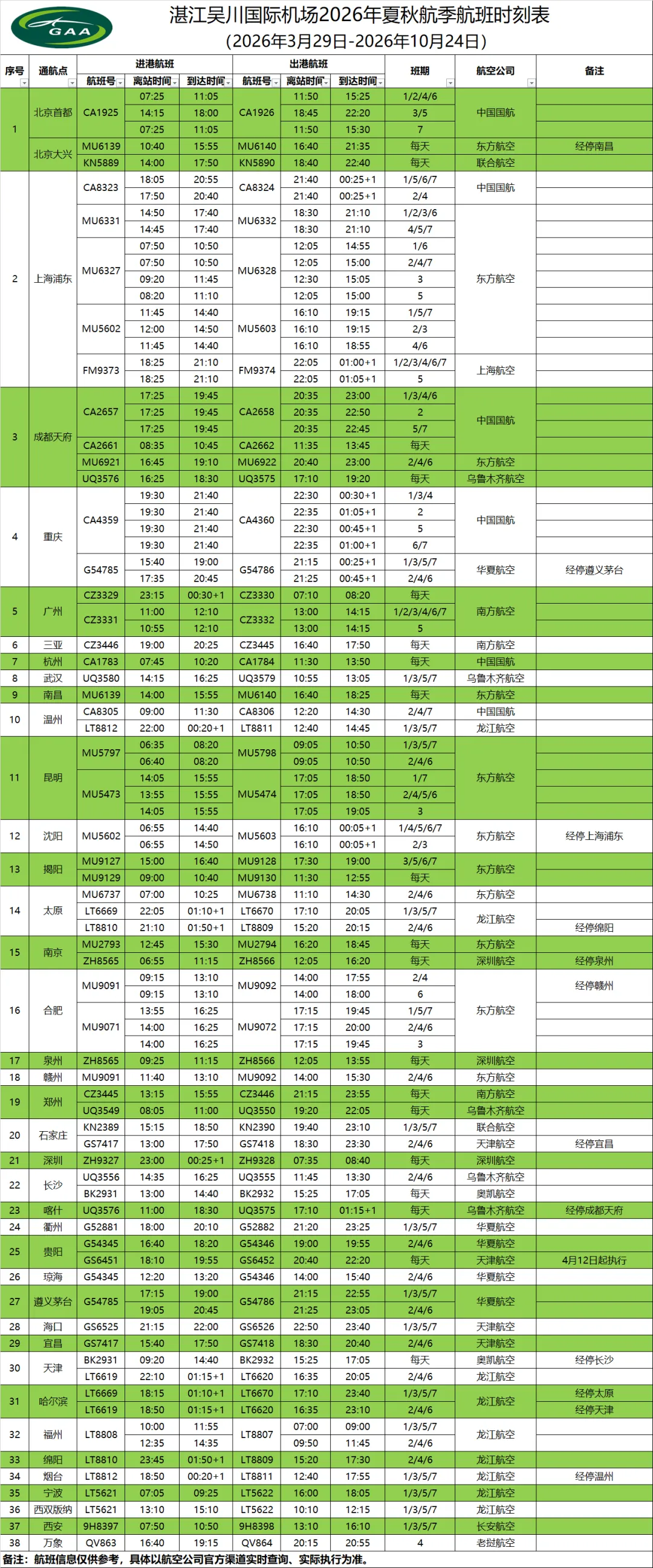 新航季,龙江航空在湛江吴川国际机场投放3架运力,其中2架为过夜运力,已开通哈尔滨、太原、天津、福州、绵阳、温州、烟台、宁波、西双版纳等城市航线;4月11日起还将新增济南、厦门等航线,持续完善粤西地区航空出行网络布局。
