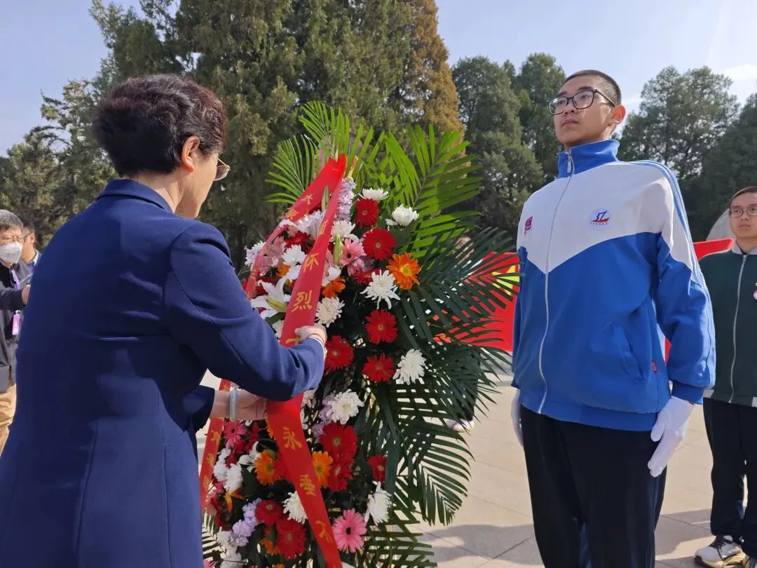 学生代表迈着稳健庄重的步伐,向革命英烈敬献花篮。李文校长缓步上前,悉心整理花篮挽联,一举一动饱含对英烈的无限尊崇与深切缅怀。