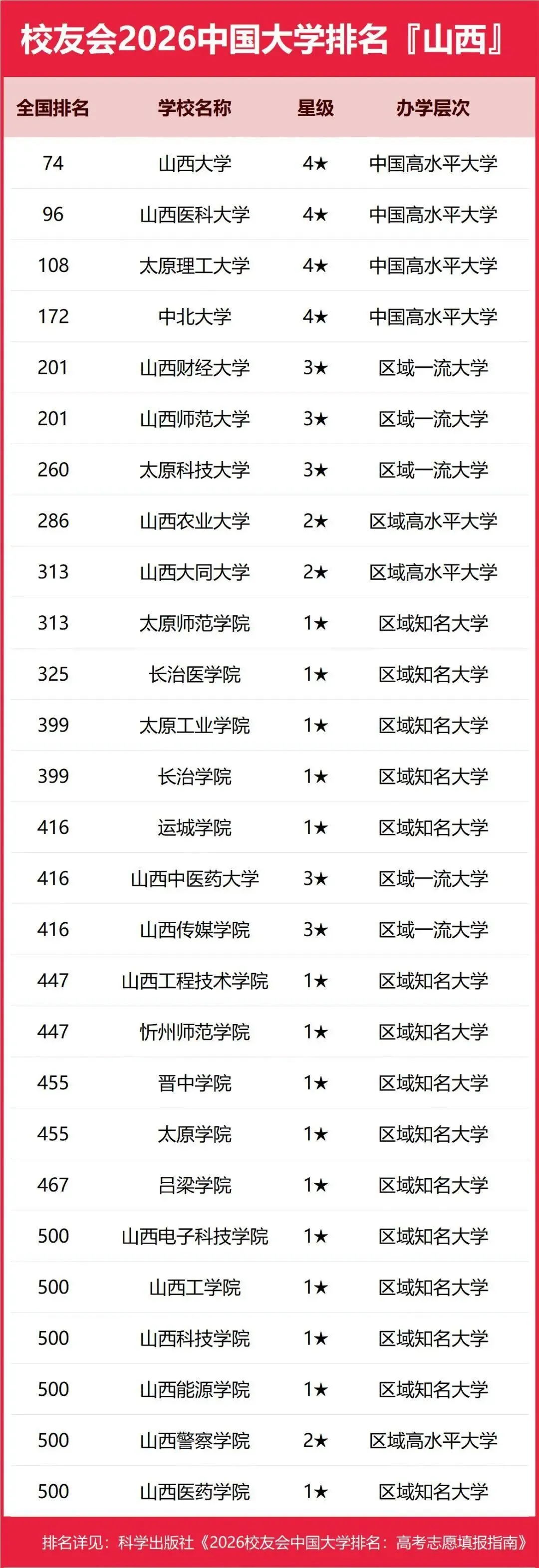 中国校友会发布最新的2026年大学排名报告,山西的高等教育水平又引起人们的注意。山西省高校的综合实力稳步提高,在全国范围内有了一定的地位。依靠不同的教育发展途径,山西的高校逐渐形成了各自不同的发展道路,给地方和全国的人才培育做出了突出贡献。