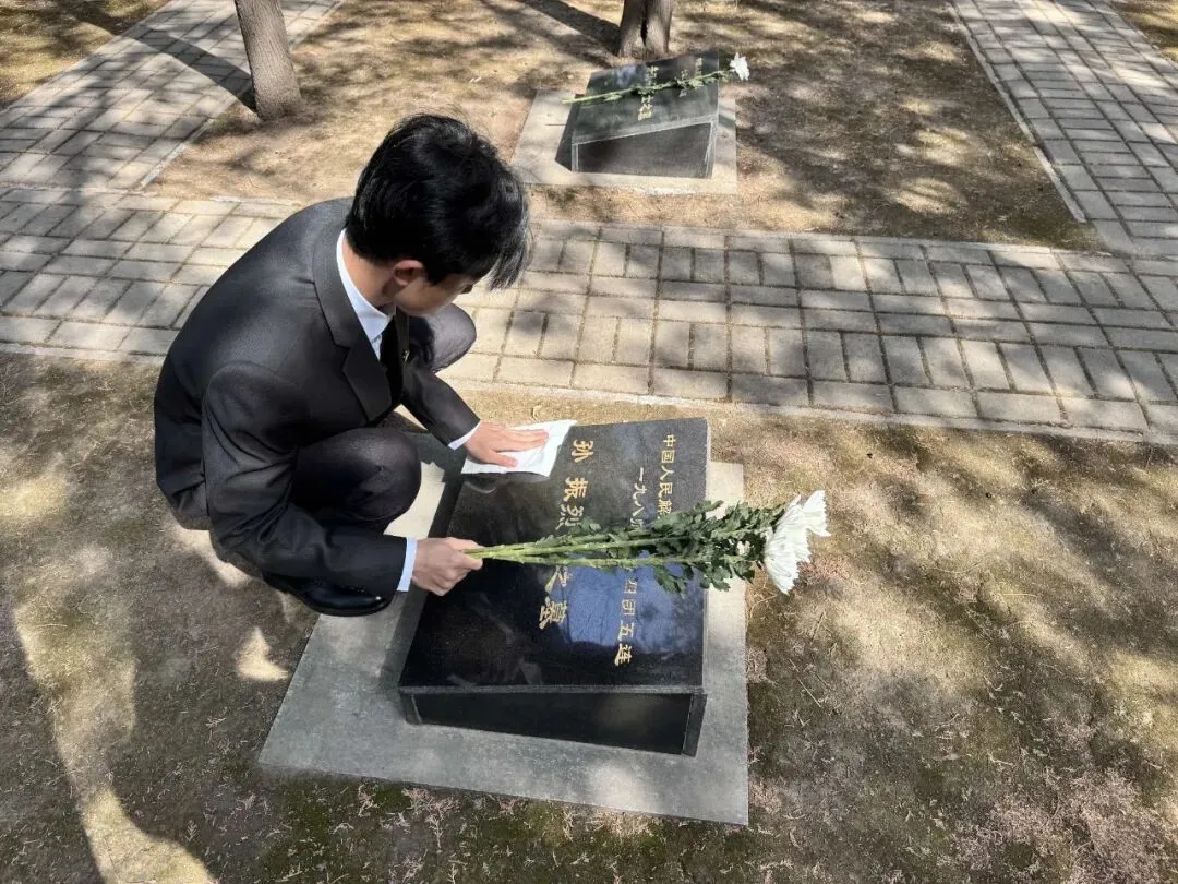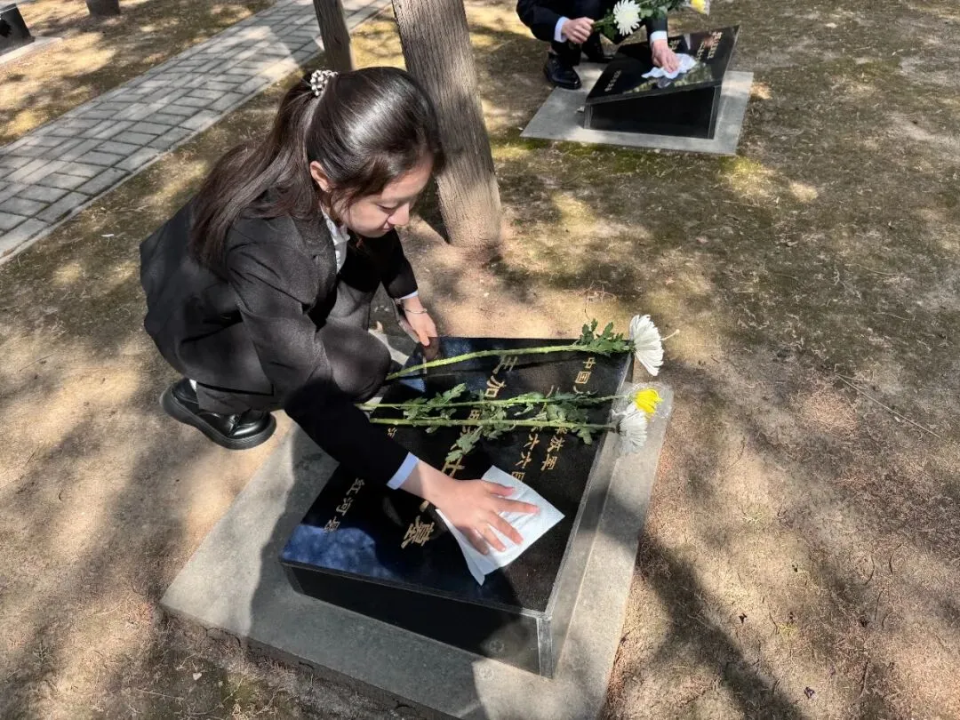 仪式结束后,师生有序进入陵园墓区。大家认真擦拭墓碑,瞻仰烈士事迹,在亲身实践中缅怀先烈、厚植爱国情怀。